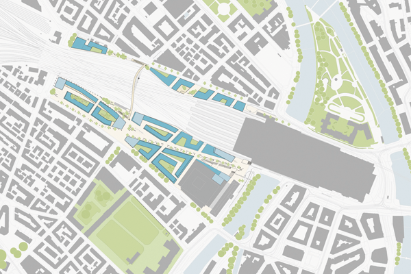 Accordingly, the immediate area around Zurich main railway station will be brought into line with modern-day requirements. It will acquire a new structure that blends seamlessly with the surrounding area. A diagonal connection drawn from the old station plaza, provides the main axis of the new station area and leads to adjacent city quarters. Perpendicular to this axis, existing streets are extended in the north-south direction as far as the railway line. Since a strip of land on the far side of the railway tracks is also being redeveloped, station and railway lines will be fully integrated into the new urban fabric. Sight lines and a new bridge across the railway unite the adjacent areas.