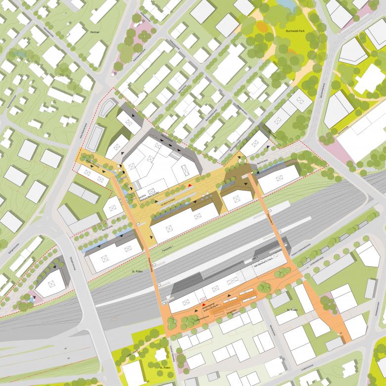 The plan focusses on three core areas: Bach-St. Fiden, the area of ​​today‘s workshop and the Heiligkreuz district, which are located within the two existing city axes St. Jakobstrasse and Langgasse. An integral part of the future image of St. Fiden-Heiligkreuz is the development of a mobility concept that ensures the expected traffic flows for the core areas and enables a significant center function at St. Fiden station.