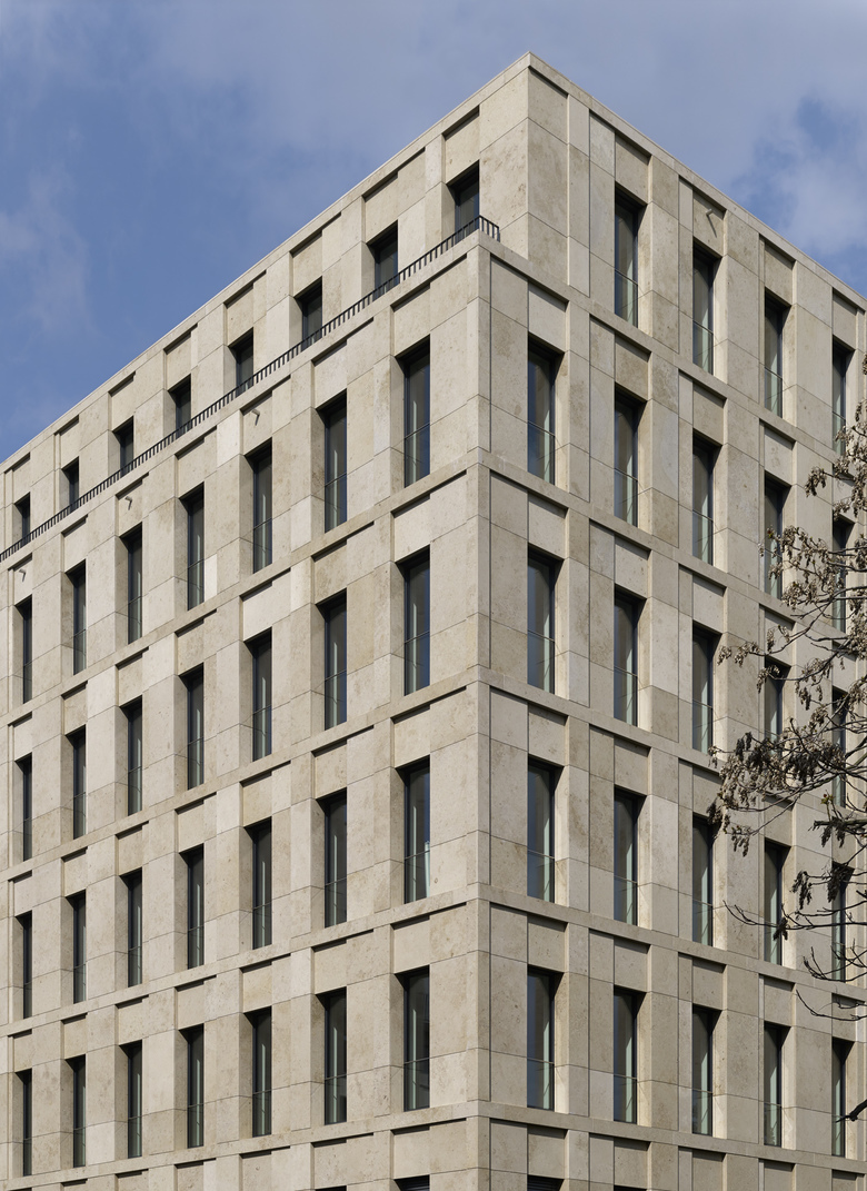 Some may experience the building on Max-Reinhardt-Platz as a coherent complex with a unifying design; others may perceive the individual construction elements as separate buildings. This is achieved through the individual design of the façade, wherein single building elements represent the variations in the underlying theme shared by the entire structure. By adjusting its height to the adjacent buildings, the scale of the surroundings that have emerged over the years is taken into account. The building houses contain a mixture of commercial and residential elements typical of Berlin. A shopping area on the ground floor enlivens the square, while the corner facing the ‘Deutsches Theater’ has been set aside for a café and terrace. The entrance lobby of the office building opens onto Reinhardtstrasse. A conference area located on the entrance level maintains its public character through its connection to a landscaped inner court. Offices ring the upper floors, and the deeper building sections contain multi-use areas for implementing modern office concepts. Both the office building and the flats have direct access to a shared underground car park.