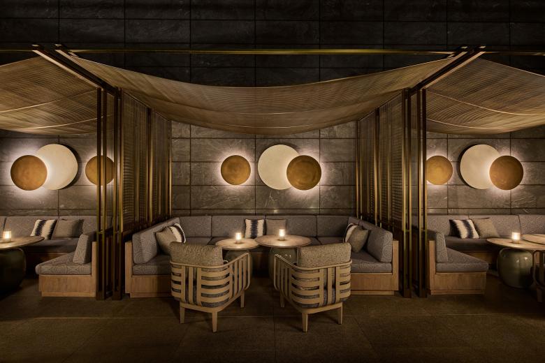 The journey then extends outward into two terraces, one alive with social energy, the other steeped in quiet contemplation. The larger Main Garden centers on a golden armillary sphere, its interlocking rings tracing cosmic orbits in a timeless expression of harmony and motion. Outward-facing seats encircle this sculptural centerpiece in a gesture of openness, extending the lounge’s embrace toward the views beyond, while a mix of seating styles invites guests to gather, mingle, and play. In contrast, the Star-gazing Garden offers a more intimate retreat: a tucked-away outdoor living room where cozy arrangements welcome couples and small groups. Here, the atmosphere turns romantic and contemplative, drawing the eye—and the spirit—upward to the night sky.