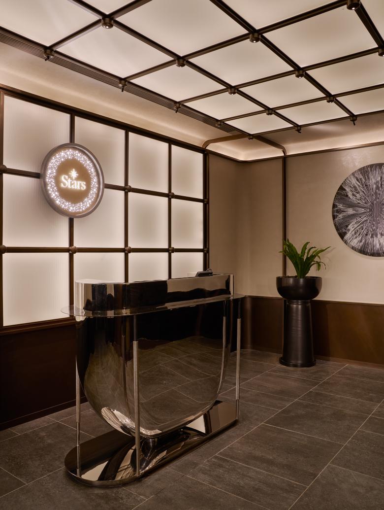 The journey begins at the threshold on the 30th floor, where a polished reception desk with mirrored curves greets visitors beneath a softly glowing backdrop, striking a balance between refinement and anticipation. Beyond it, the corridor acts as a passage into another realm: a mirrored ceiling stretches the perspective while reeded glass walls blur the outlines of the garden outside. Cutting across the surface, a luminous glass “belt” etched with solar system motifs anchors the design with a delicate nod to astronomy. These materials shift in character with time—by day, shimmering with natural reflections that suggest openness and clarity; by night, glowing softly as the circular ceiling light transforms into a floating cosmic feature that ushers guests deeper into the atmosphere of STARS.