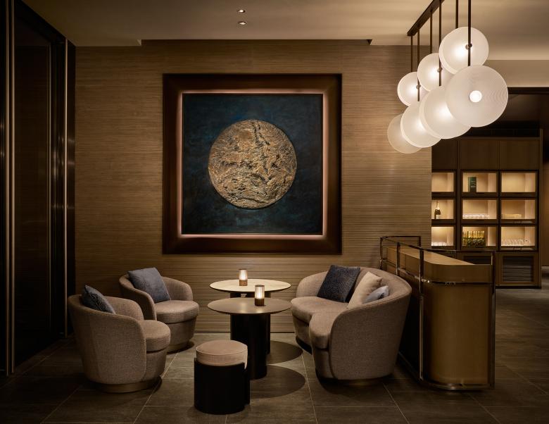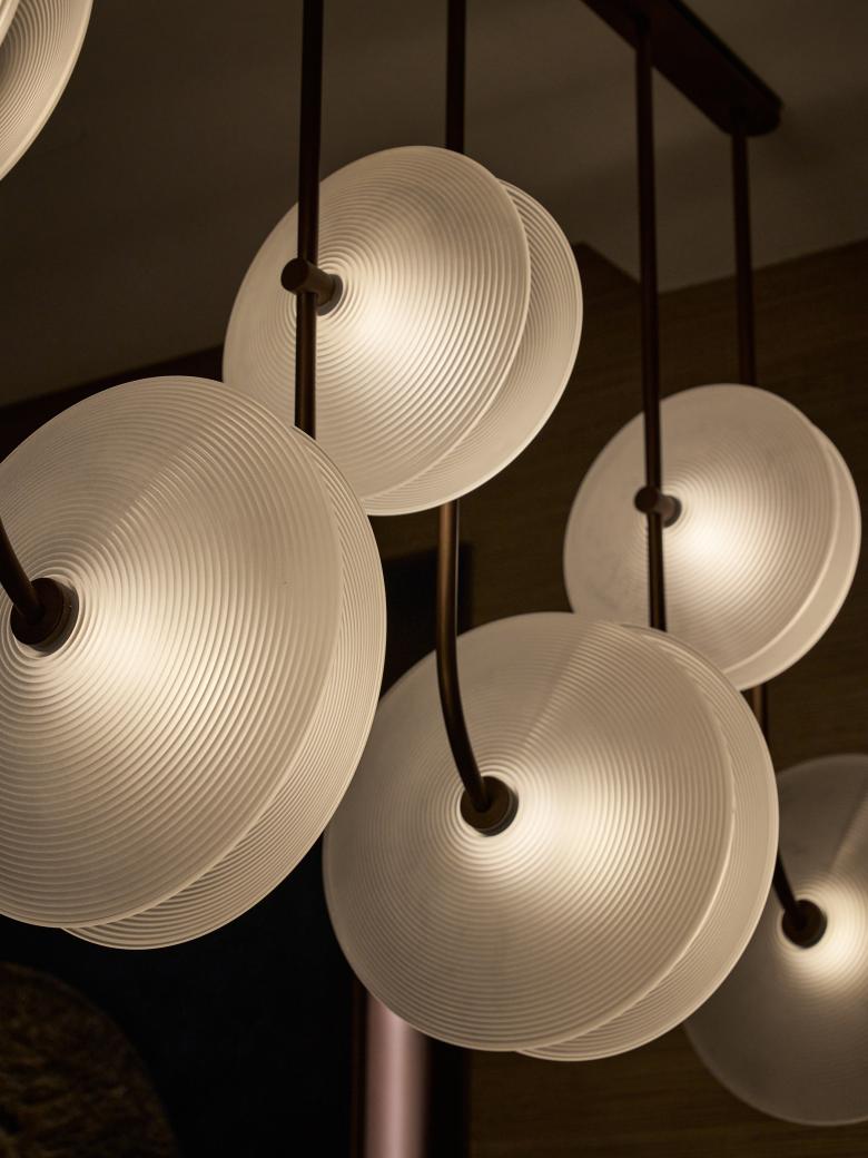 If the terraces embody a communal form of intimacy—inviting quiet conversations beneath the open sky—the Private Dining Room translates this same spirit of seclusion into an indoor setting. Conceived as an exclusive, residential-inspired setting, the Private Dining Room recalls the warmth of the astronomer’s own living room. A mix of lounge seating and dining area opens to corner views of the city, creating a setting that feels expansive and light-filled by day, yet transforms into a cocoon of intimacy as night falls. The atmosphere is enriched by subtle astronomical references, from tactile finishes to thoughtfully placed lamps. Above the dining table, custom-designed pendant lights—formed of overlapping ripple-glass discs inspired by ancient star-gazing instruments—evoke a celestial rhythm, casting a soft, radiant glow reminiscent of starlight in motion.