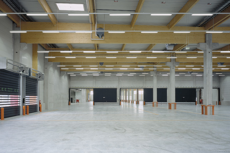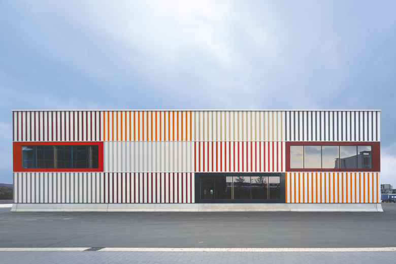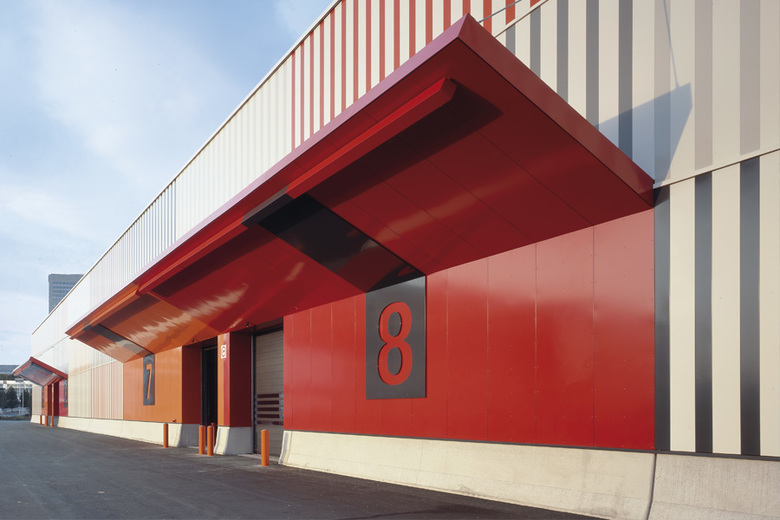 Konstruktion Der Rohbau der Halle besteht aus einer Fertigteil-Kombination der Materialien Beton und Holz, da sich die Konstruktion für diesen Gebäudetyp als sehr ökonomisch und Ressourcen schonend dargestellt. Hohe eingespannte Betongabelstützen tragen die hölzerne Dachkonstruktion aus 2 m hohen Brettschichtleimbindern. Die Hülle besteht aus einem modularen Fassadensystem, das mit zwei unterschiedlichen Profilbreiten und acht Farben spielt.
