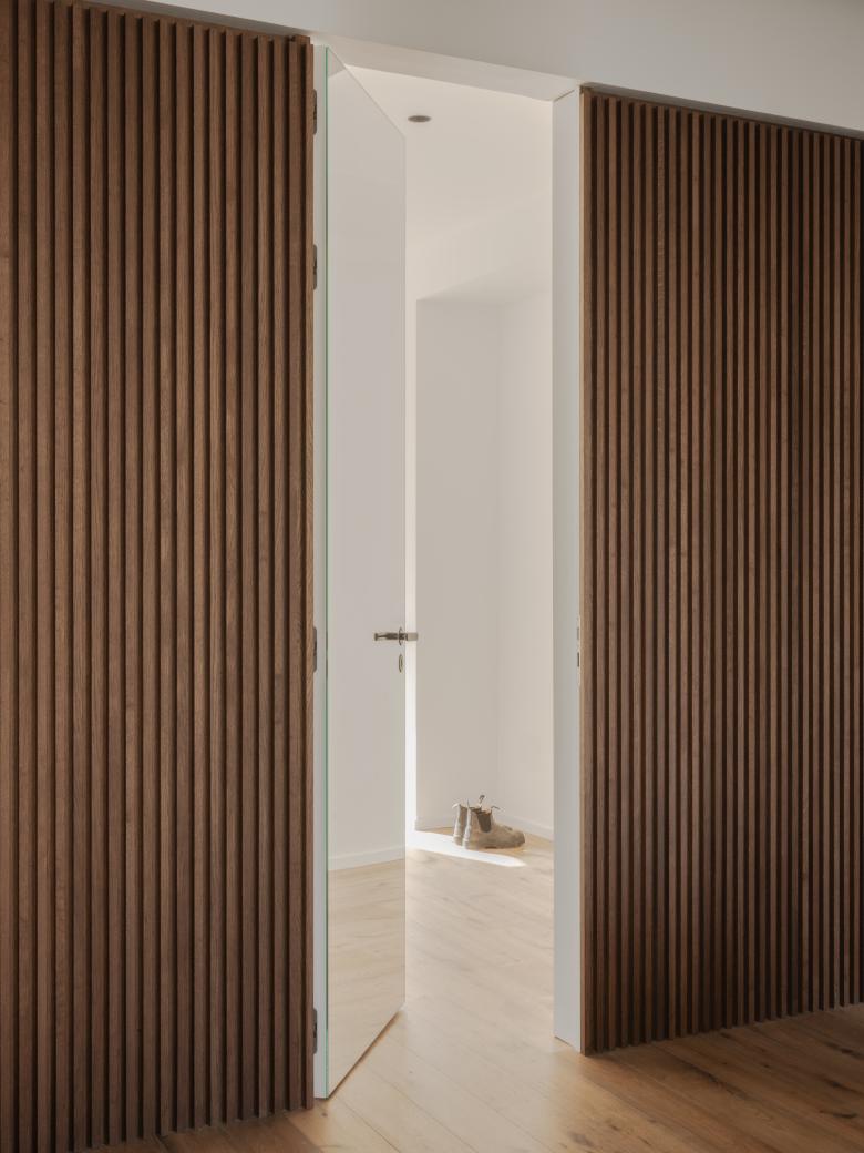 L’intento progettuale è quello di separare in modo netto le due aree della casa: quella pubblica e quella privata. Le pareti sono rivestite con una boiserie in legno listellare di rovere, all’interno della quale si integrano porte a tutt’altezza che conducono alle camere.