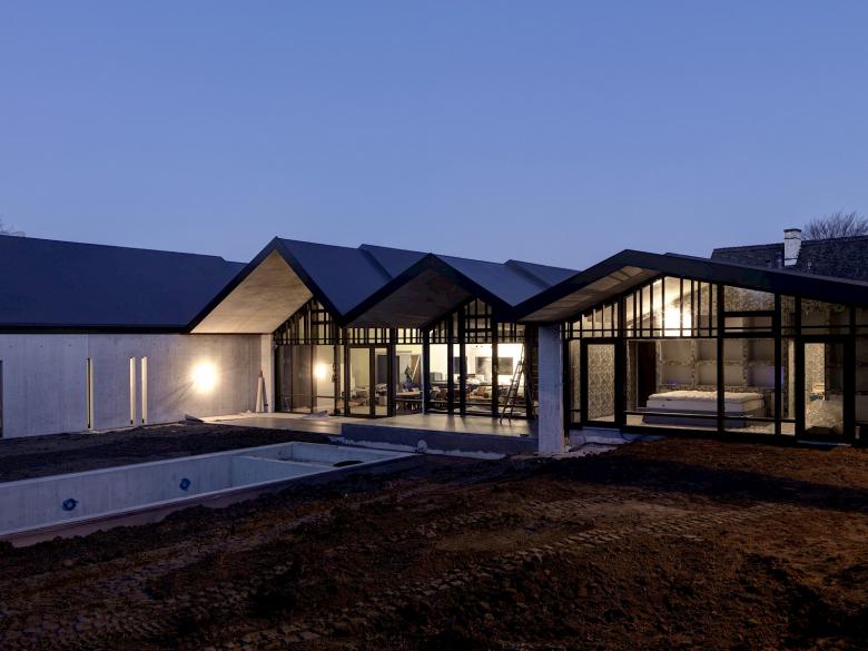 Das Projekt besteht aus drei Bereichen, die durch Wandschotten getrennt und zueinander verschoben sind. Das Dach in Sichtbeton ist formell als grosses gefaltetes Element ausgebildet und verbindet die Volumen wieder zu einer Einheit.