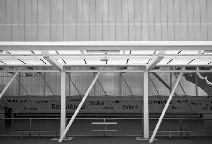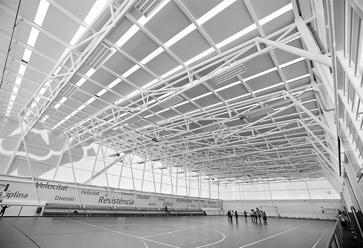 Ciutat de Reus: The "polilleuger" of CEIP Ciutat de Reus appears in the need to cover the existent sport ground. The project spans the whole plot, so it takes the advantage of adapting a second sport ground, the exterior games area, the children patio, the acces area and the perimetral fence. Both the structure and the facade's material are studied based on sustainability criteria and the posterior maintenance cost of the facilities. So it archieves a very light weight project with a execution cost per m2 way lower than the standard module establish by the official organization. Alberich i Cases: The "polilleuger" project is intended rethink architecture based on new concepts of sustainability and low maintenance. The field is covered by a tubular metal supports lined of sandwich panels and polycarbonate sheets. That same cellular translucent polycarbonate is also used on the front, while the other elements (harrows, services, changing rooms, storage …) are made of concrete. The result is a facility that has a low cost of implementation without resign a formal and spatial quality with a completely contemporary look. Celia Artiga: The good results obtained by the two previous "polilleuger" experiences encourage the Reus City Council to make a third one. In this case, the intervention is not limited just to the sports hall and the development of its immediate environment, but rather extends beyond the boundary of the plot. Thus, in addition to attending social and economic circumstances of the moment, the project is considered in four distincted phases: the "polilleuger" the interior complex and its surroundings, bleachers and the new inverted traffic priority step.