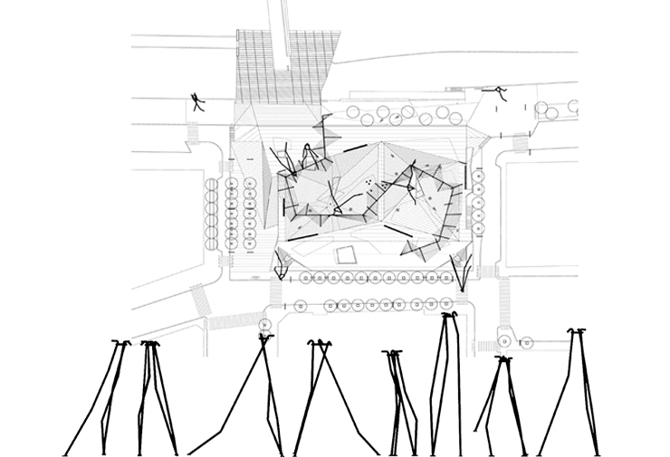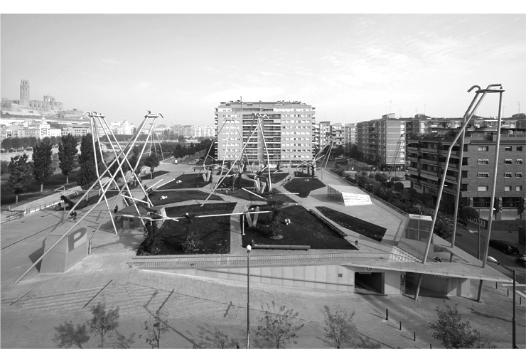 The proposal is defined in plant as an area bounded in width to the geometry of the existing roof, while extending the other direction until it reaches the wall of separation of the river Segre, on the one hand, and over the edge of the roof in the side of Valencia street, and on the other hand, in the form of cantilever slab melts existing chamfers. Based on the existing parking lot an artificial topography is created, formalized by the intersection of two pyramids, which merges with the Segre river and connects with the sidewalks of the surrounding streets with inclined planes, ramps or stairs, thereby continuous urban routes.