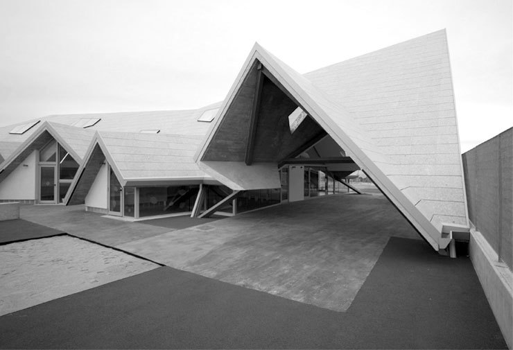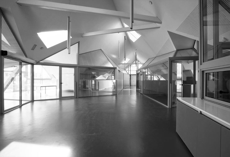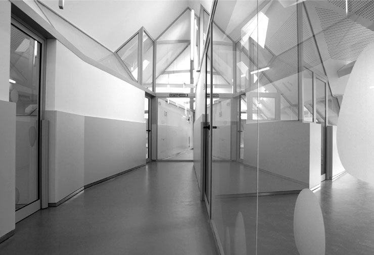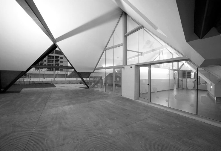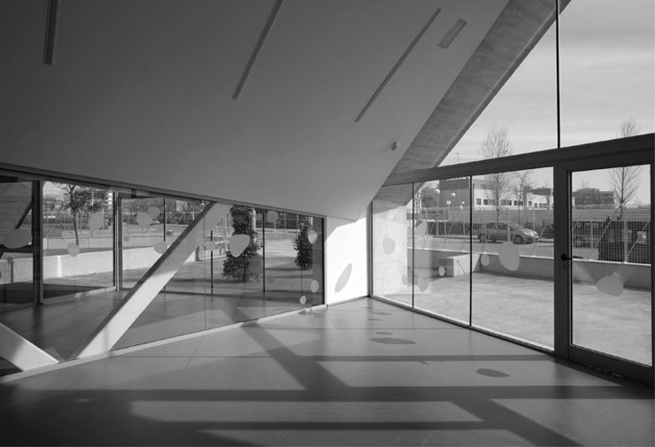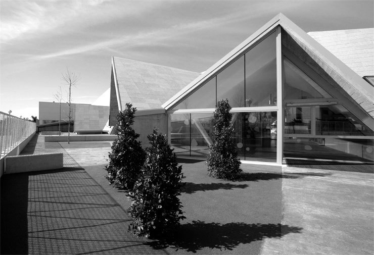 The geometry of the project articulates the space. Constructively inspired in a traditional mansard roof, we were interested in how it could remember the first pictures of a house children draw. Once inside people are surprised by the volume. The spatial experimentation is focused on three pyramidal bodies that intersect forming a single body with smooth changes of direction. The volume is crossed by twelve mansards, that open into a courtyard setting visual communication between interior and exterior. The fact that the roofs do not touch the ground and give the impression of floating and light can enter by the perimeter. The granite placated gives the building an urban image. The porch takes the whole height, being the highest place. The building has offered an innovative space for the town. The use for a kindergarten offers, if possible, more sense to architectonic experiment, which starts from the free view of childhood, the fascination of the kaleidoscope and the poetic image of a child on a swing.