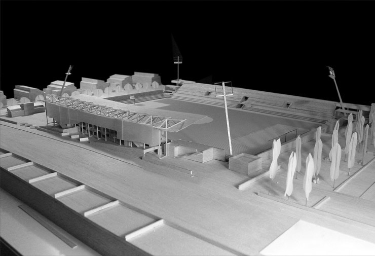 In February 2002, the City of Reus considers the future of the sports complex. It started up a series of interventions to improve urbanization and facilities while they remodeled the west tribune of the stadium. The new facade is formed by a glass wall that deforms to fit different widths of the spaces, the presence of mountains on the horizon Musara, gave traces the lines of the facade had to convert building in a facility unique. The image of this cloud of tear and elongated changing reflections captures the attention of those entering the city by this point, providing the dynamism necessary to promote sporting expectations.
