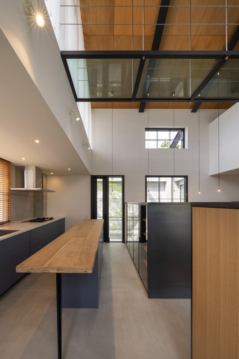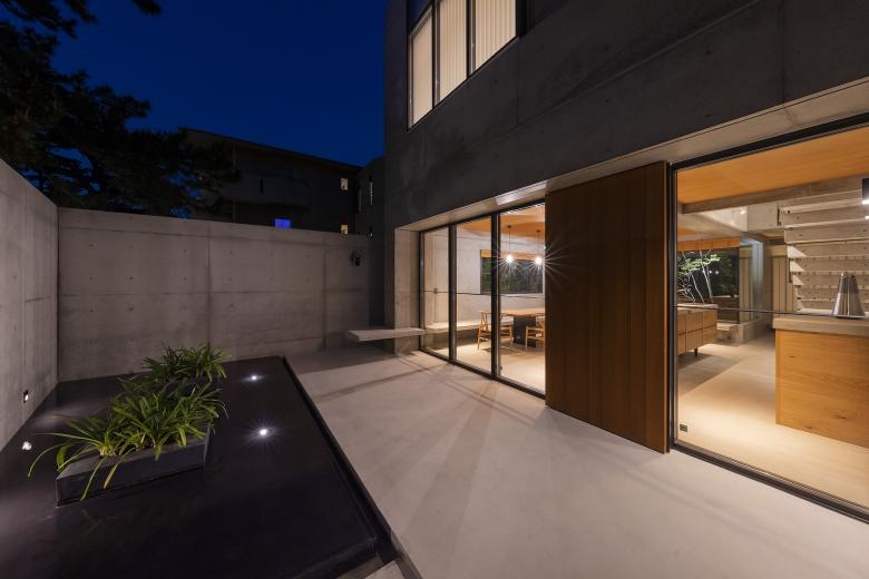 The design creates a fundamentally visible yet private environment by establishing a frontage facing the road as a lush open space incorporating parking and an approach.The exterior walls are finished entirely in exposed concrete, while the roof is gabled, spanning over H-beam girders. This combination of concrete and H-beam creates a dynamic impression.
