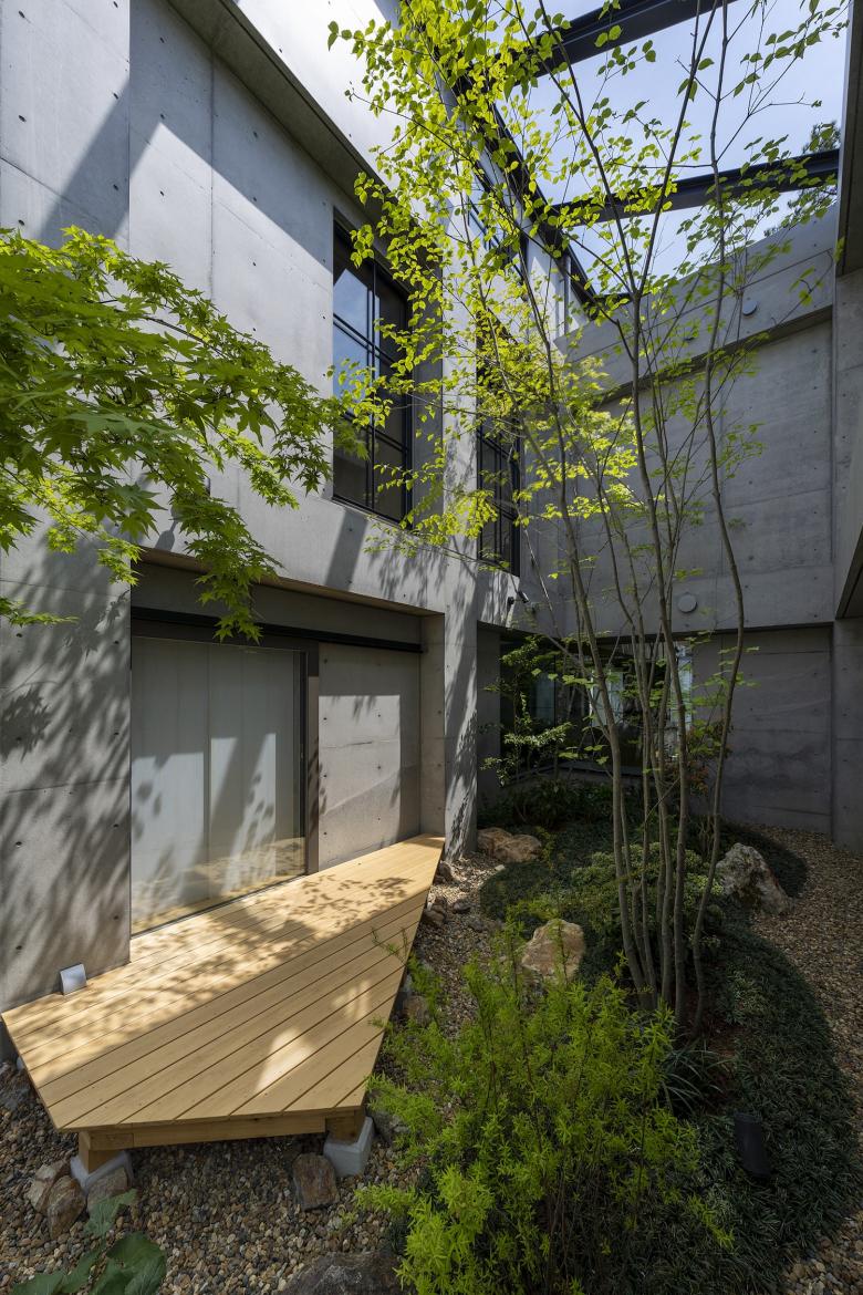 Internally, the space is defined by the expansive pine grove along the Shukugawa riverbank to the east, the Hankyu Railway tracks to the west, and two north-south courtyards on the western side. These courtyards act as privacy buffers, creating ambiguous transitional spaces between interior and exterior.