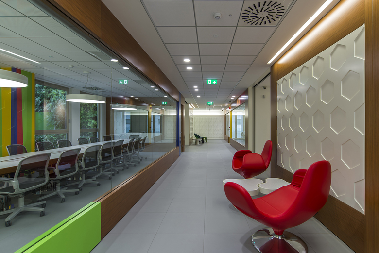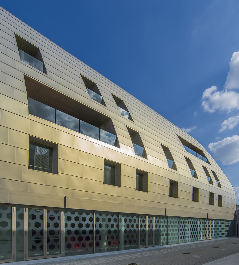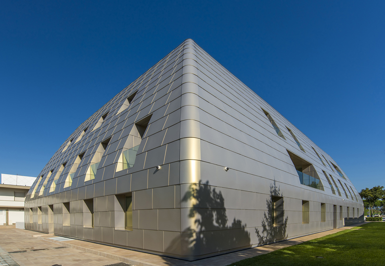 This building strongly characterized, keeps in its design the corporate identity, it has a monolithic appearance and it is well rooted to the ground, but the main front opens outwards, with a large multicolored glass window, which at night turns into a large lamp. It is entirely covered by an iridescent metallic skin, it changes color when the light vibrates on it, it looks like a big gold ingot.