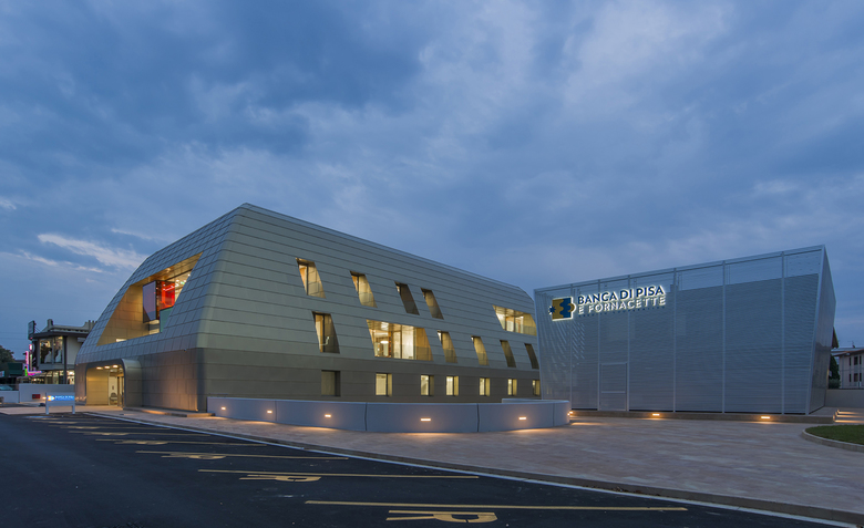 The front side of the main entrance, overlooking via Tosco Romagnola, is aligned with the other bank building, while the back side, where are located some of the parking lots, is opened on via delle Case Vecchie.