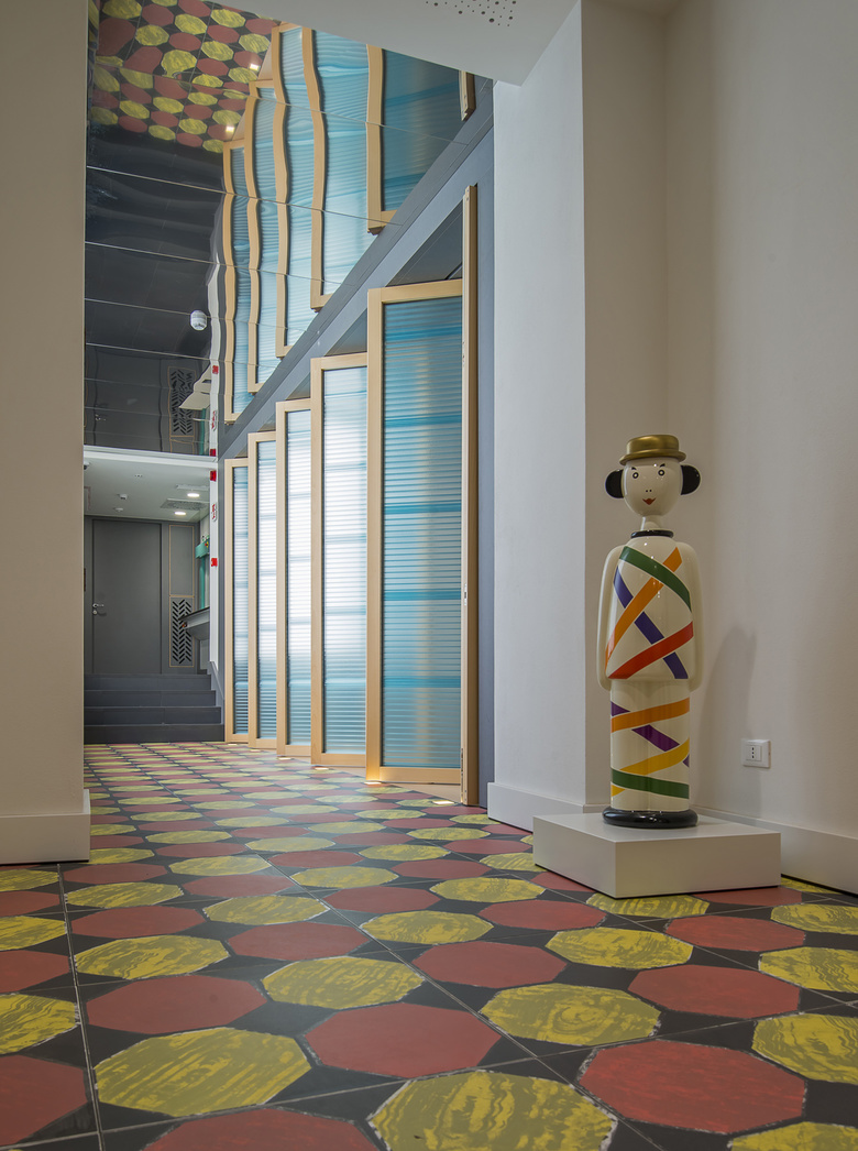 Outside the building maintains a uniform appearance, with its historical “face” almost unchanged and it integrates well with the other façades overlooking the river. Inside, due to the need to replace the flooring in all the rooms with new and more practical ceramic tiles, the project gives a nod to the traditional décor with marble grit tiles from the 50s, magnified through a reinterpretative pop lens. Therefore, where the flooring is colourful, the furniture becomes lighter and more moderated, while in the rooms where the panelling is black and white, the cupboards, tables and chairs are brightened up in intense shades of red.