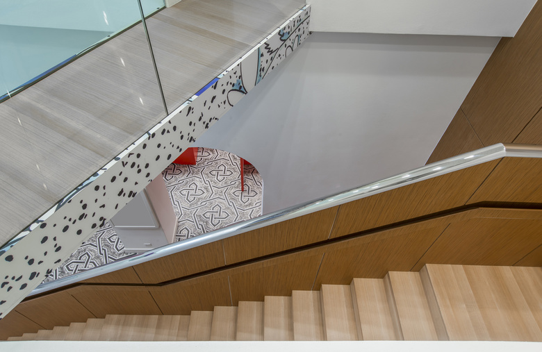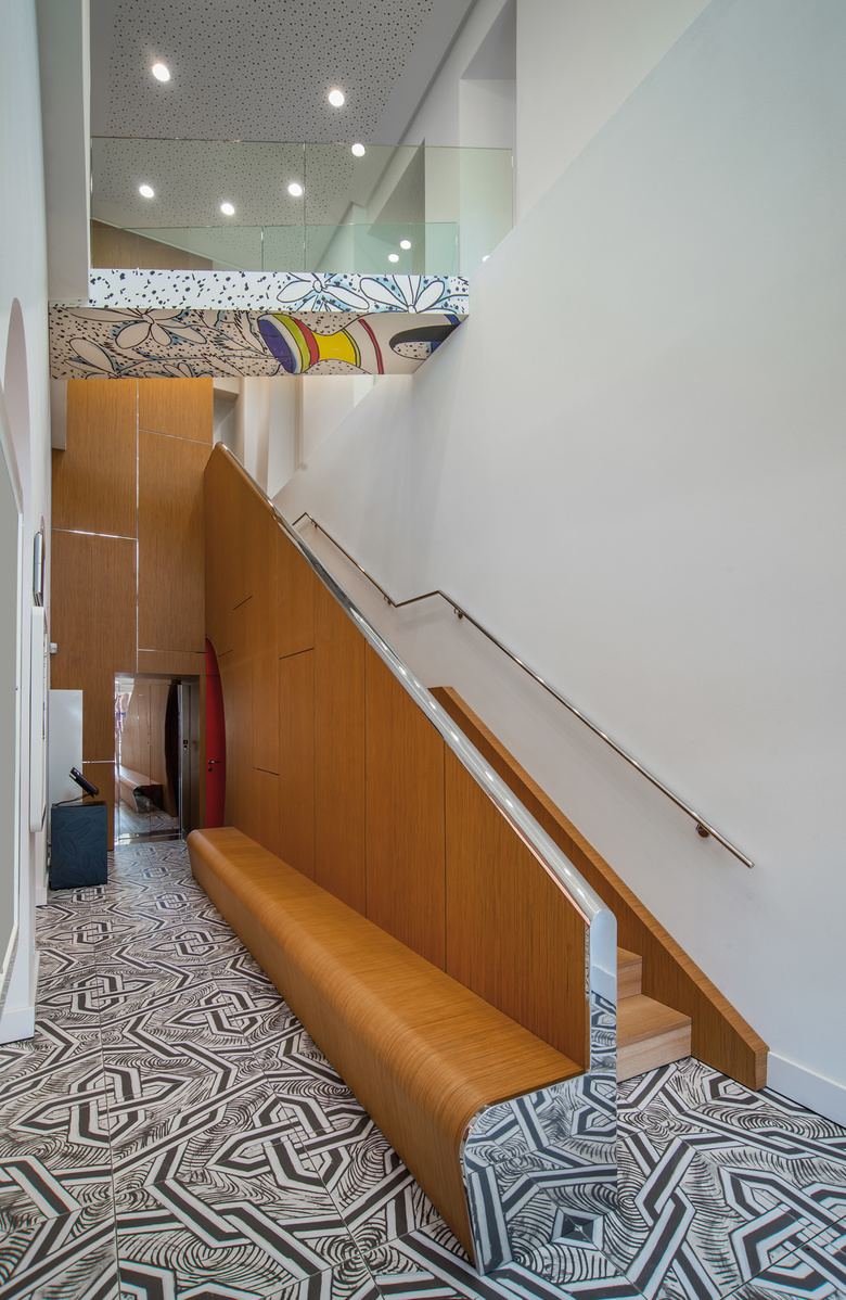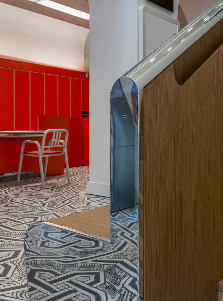The ground floor, which has a usable area of about 100 square metres, houses the entrance, the hall with the cash registers and the vault. Through the entrance you enter a double-height space, crossed by two coloured bridges, within which there is a teak-wood staircase that goes up to the top floor.