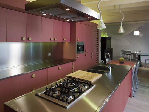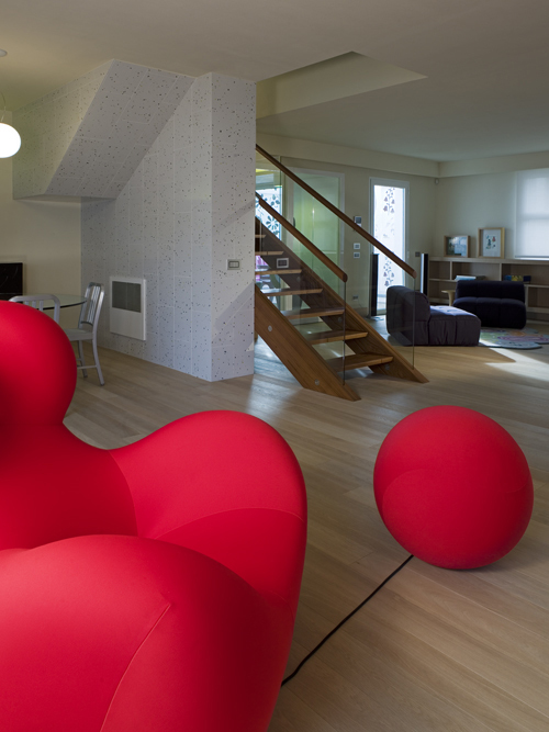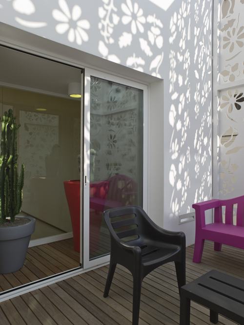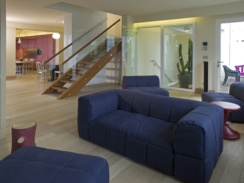 The Stefano’s house is located in Navicelli road, between the historical center of Empoli and the Arno river. The project concerned the renovation of a residential building which was built in the earliest of 1960’s. The plan was to empty entirely the interiors so we could reorganize the interior floors height; in the same time we designed the new façade on the main front without any increase of volume. The building is developed on three floors above the ground; from a monofamiliar house it turned into a bifamiliar house, with a few offices on the ground floor. Each new house measures 200/220 square meters about, both the two have the entrance door along the main road as the garage and a service room. The first floor holds the living room, the dining room and the kitchen, each one offers many different views. There is a terrace along the road which is shelded by an aluminium wall with laser pierced flowers; on the other side the kitchen and the dining room overlook on the interior patio with the hydromassage pool. In summer it can be closed on the top by the motorised curtain-blind so it turns into another room. A teak staircase connects the living room with the night zone on the upper, floor which is opened on the river on a side and the city’s roofs on the other. A small green house amuses the home entrance.