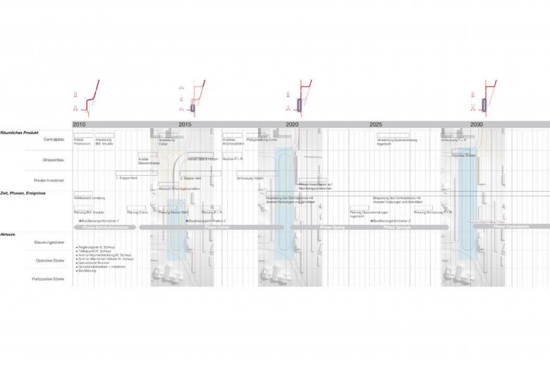Der Bahnhofplatz Brunnen präsentiert sich als planlos gewachsenes, heterogenes räumliches Konglomerat. Der Ankommende kann sich schlecht orientieren, die Strassenführung ist für die ehemaligen industriellen Nutzungen optimiert, zudem dominiert das teilweise sehr hohe Verkehrsaufkommen die Stimmung dieses Ankunftsortes. Durch den Zusammenschluss der Gemeinden Ingenbohl und Brunnen, die geplanten Veränderungen auf den Industriearealen Herti/Holcim und die in der Richtplanergänzung Rigi-Mythen vorgesehene neue Verkehrsführung entsteht die Chance, eine innere Aufwertung vorzubereiten. Dafür wurde eine Konzeption gesucht, die den Bahnhofplatz als verbindendes, zentrales Element versteht und ihm eine adäquate Erscheinung verleiht. Innerhalb eines interdisziplinären Planungsteams (Verkehrsplaner, Architekten, Landschaftsarchitekten) wurde nach Strategien gesucht, die in einer schrittweisen Veränderung den Platz räumlich und verkehrstechnisch optimieren können. Die heutigen Verhältnisse wurden kritisch analysiert. Nach Variantenstudien wurde der „ideale Zustand“ des Bahnhofplatz als grosser, ovaler Kreisel entwickelt. Im Entwicklungsszenario wurden die Ausbauphasen und die für die Umsetzung benötigten Elemente auf einer Zeitachse abgebildet. Die aufgezeigten Lösungsansätze sind bewusst konzeptionell gehalten. Sie schlagen eine starke räumliche und verkehrstechnische Struktur vor, welche die bereits absehbaren zukünftigen Anforderungen aufnehmen kann. Gleichzeitig ist sie so flexibel, dass sie auch noch unbekannte Veränderungen integrieren kann, ohne an Grosszügigkeit zu verlieren.