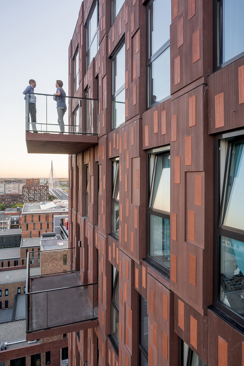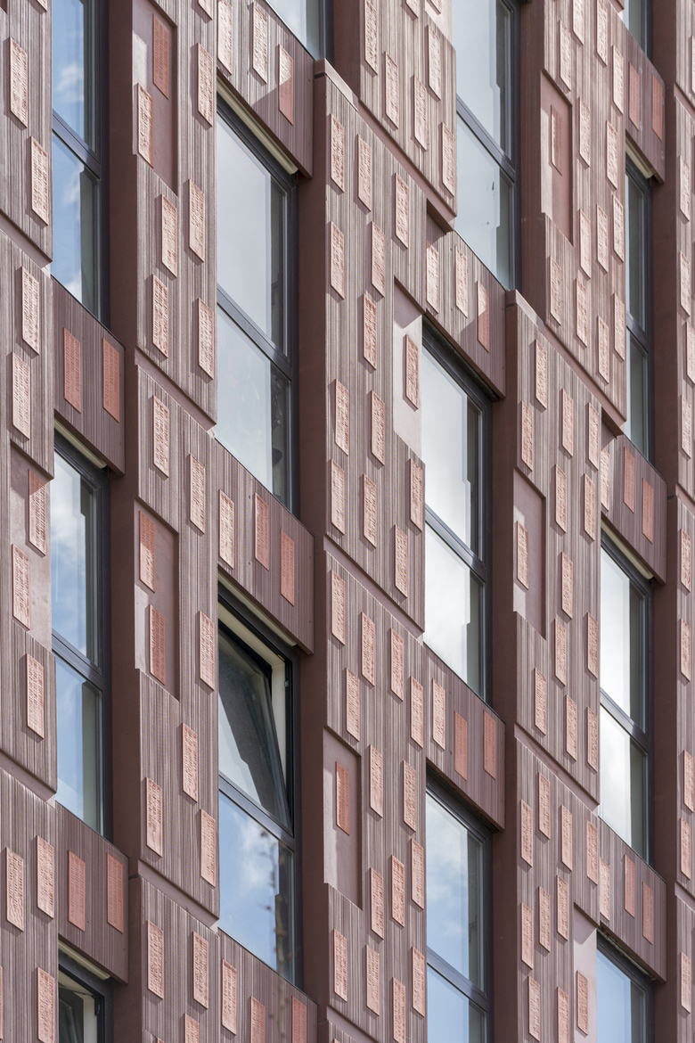 The facade is ‘slow made’ with consideration of local materials and production techniques. The colour harmonizes with the brickwork facades of neighbouring new developments on Churchilllaan, but it is constructed of concrete. The brown concrete elements, each two floors tall, possess surface texture and relief details. This effect is enhanced by the incorporation of 13,000 ceramic tiles, made by Royal Tichelaar Makkum – the oldest company in the Netherlands and world-famous for its ceramics designs. Based on a design by visual artist Milou van Ham in collaboration with poet Tsead Bruinja, these tiles feature 16 different lines of poetry that lend the building an identity specific to the location.