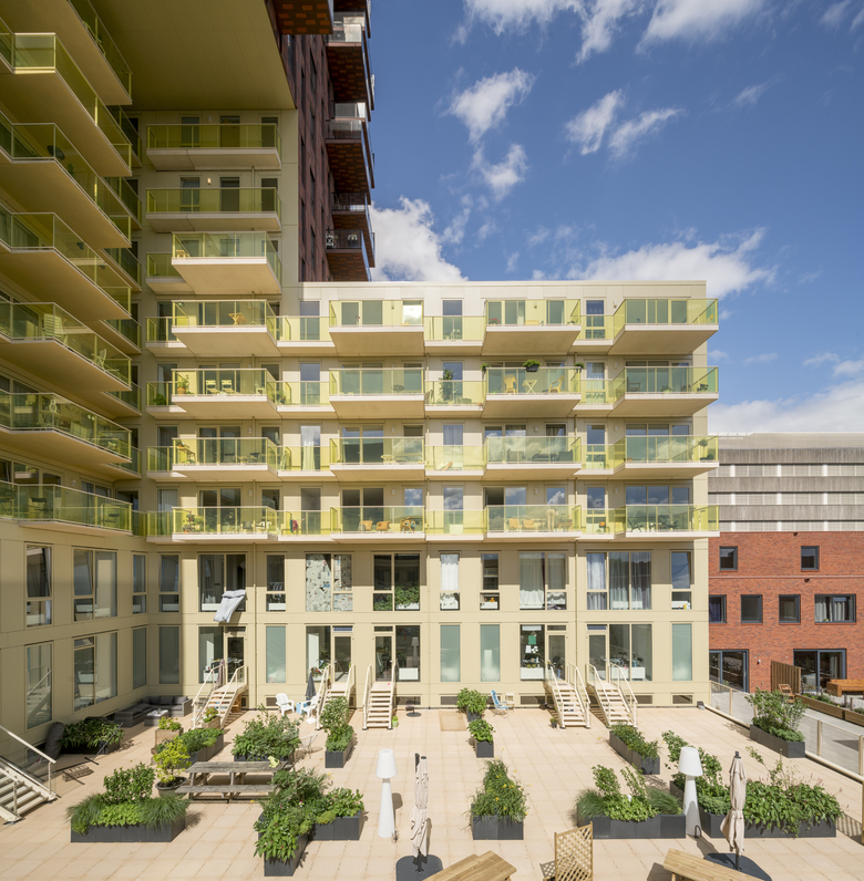 The materials used for the inner facades contrast starkly with the outer facades, enhancing the plasticity of the building. Railings in yellow glass and champagne-coloured frames ensure that, even when the weather isn’t great, De Verkenner still has a sunny and sparkling appearance that radiates throughout the neighbourhood.