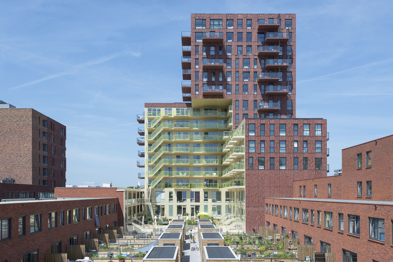 A new residential tower completed on Churchilllaan in Kanaleneiland, Utrecht, will give a big impetus to the development of this typical post-war reconstruction district. The new 50-metre-tall building, designed by Mei architects and planners, acts as a gatekeeper to Kanaleneiland. The tower contains a mixed programme of housing: 71 private sector rental dwellings in the upper portion, 15 dwellings for autistic youths, and 9 live-work units in the base of the building.