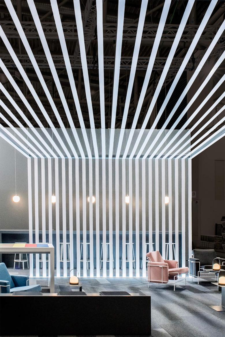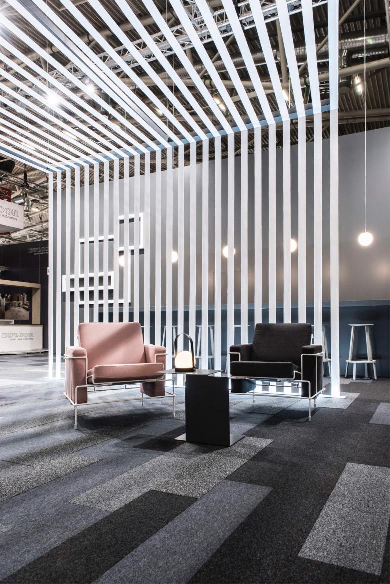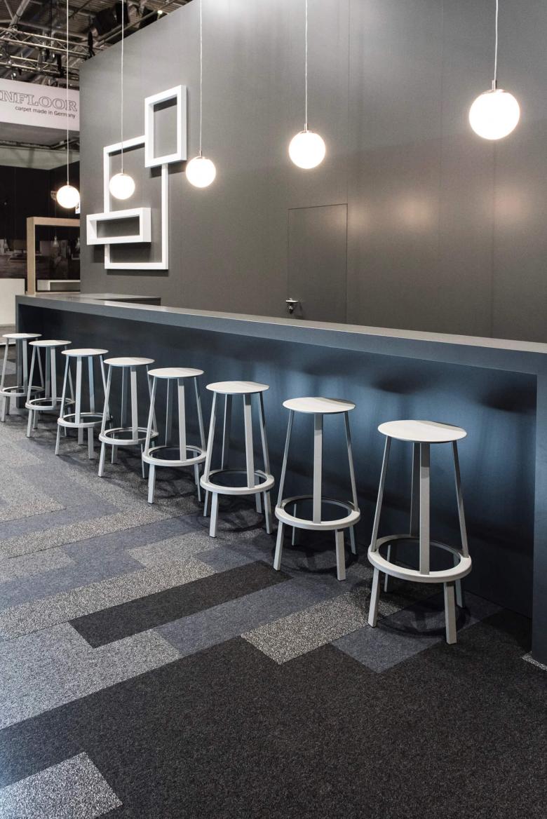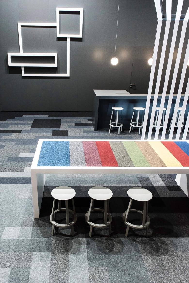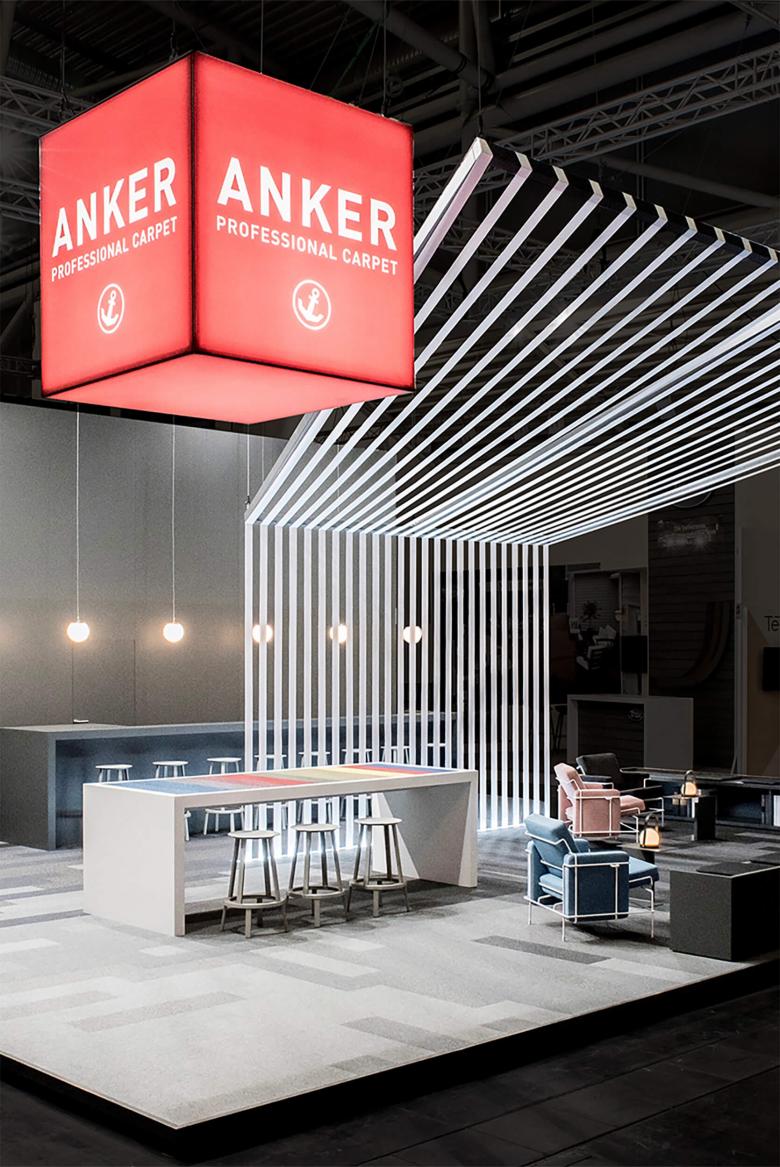 Die Storyline des Messeauftrittes von Anker erzählt zwei Geschichten: Die der Tradition in Form eines symbolischen Webstuhles, der für das lange Bestehen der deutschen Teppichweberei in Düren steht und die Faszination dieses Handwerks vermittelt. Die andere Geschichte ist die von „Core Modular“, einem neuem Formatmix der Teppichfliesen, die den Gestaltern viel Spielraum bei der Verlegung lassen und sich in eleganten Grau- und Schwarztönen über Stand ausbreiten. Dem beiseite gestellt sind die modern verspielten Möbel von Konstantin Grcic, die ein klares Bekenntnis zum neuen Design bekunden und den Bogen aufmachen für ein kreatives Handling der Teppichfliese.