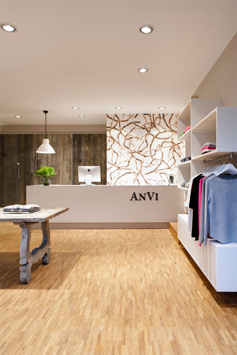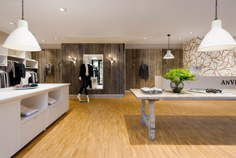So a fashion shop was created, which combines those things: an old wooden table from Holland, designer wallpapers from Italy, deer antler lamps from the USA, and fine carpenter work from Bavaria.