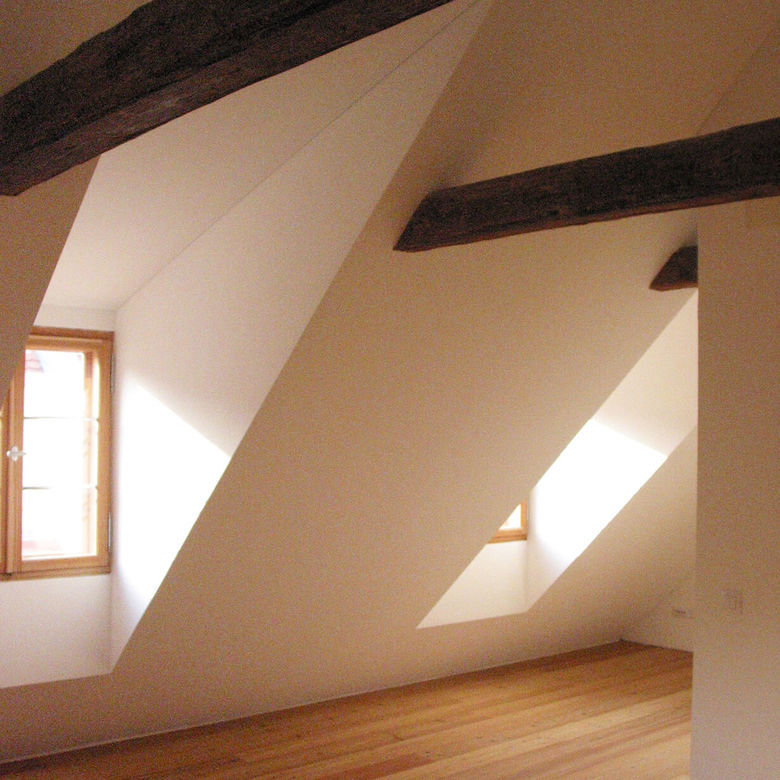 The priority was a sensitive handling of the historically precious built volume as well as artistic measures. The material for the windows, doors, floors and stairs is consistently larch wood. Black and white give a peaceful atmosphere to the interior. Clear and simple details function in their simplicity. Therefore the facade prize in 2004 is even more enjoyable, which granted this building a quiet humbleness among all the listed buildings of Munich.