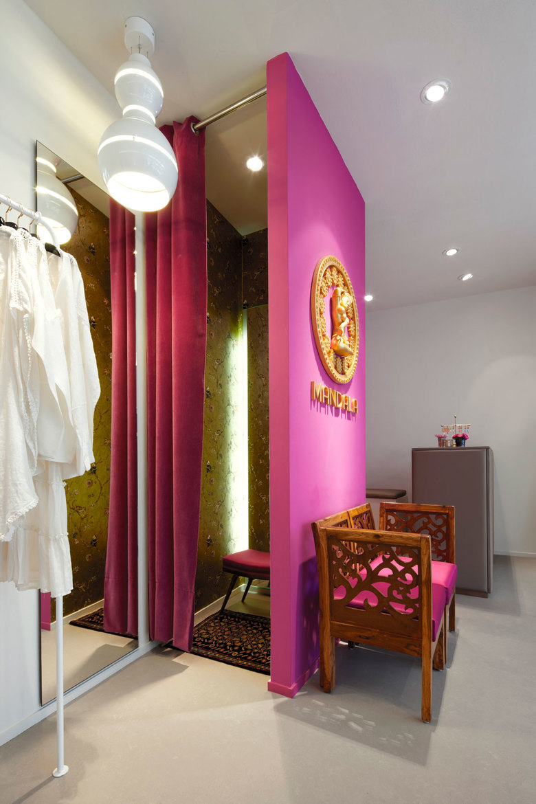 The strong pink of the buildings walls is accompanied by an elegant grey and a soft white. The connection to India is made through golden elements (such as the brand’s logo),tiger-patterned wallpapers and the paintings on the furniture.