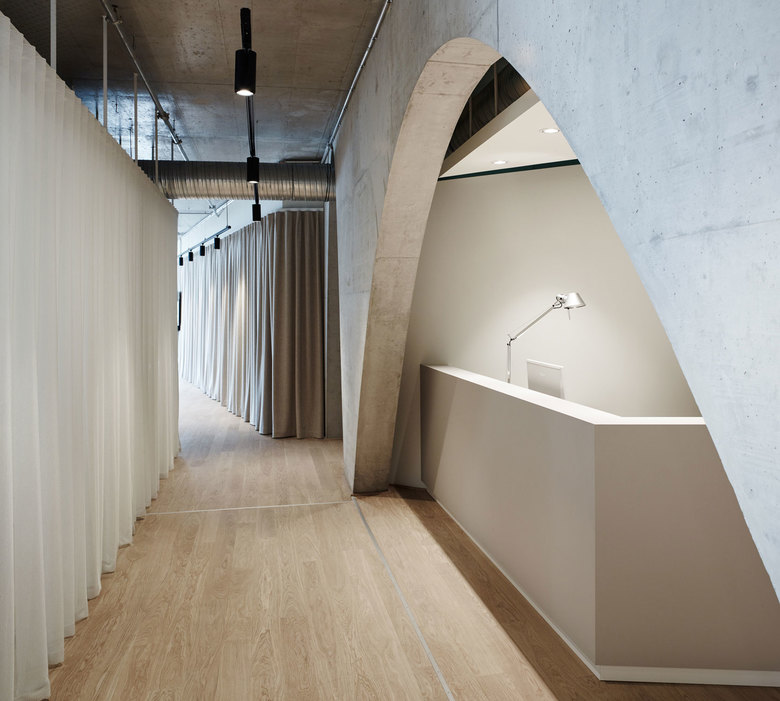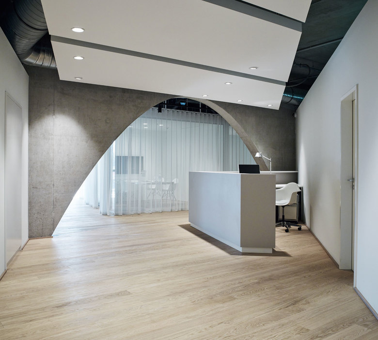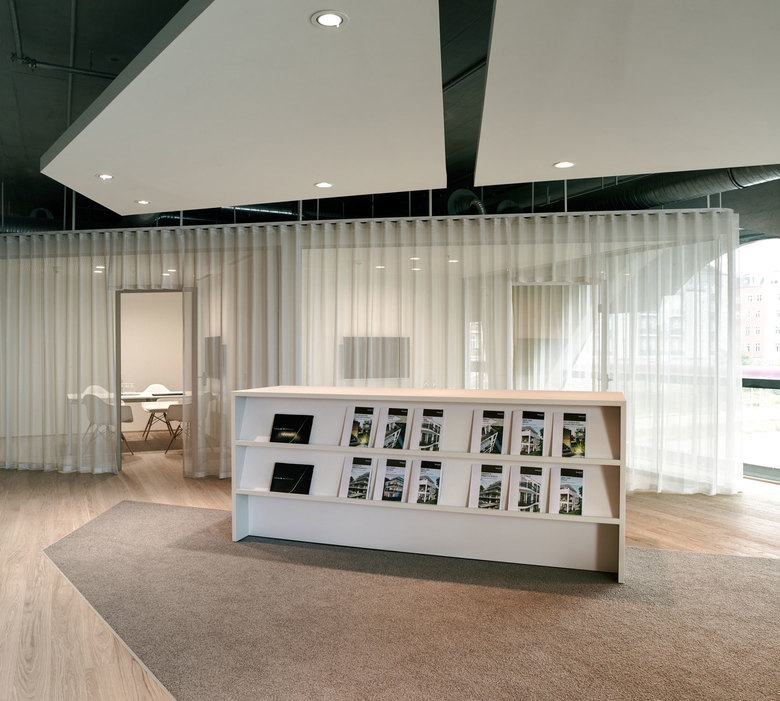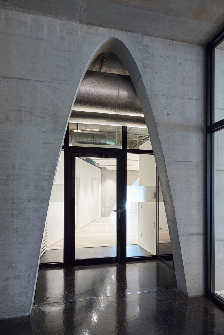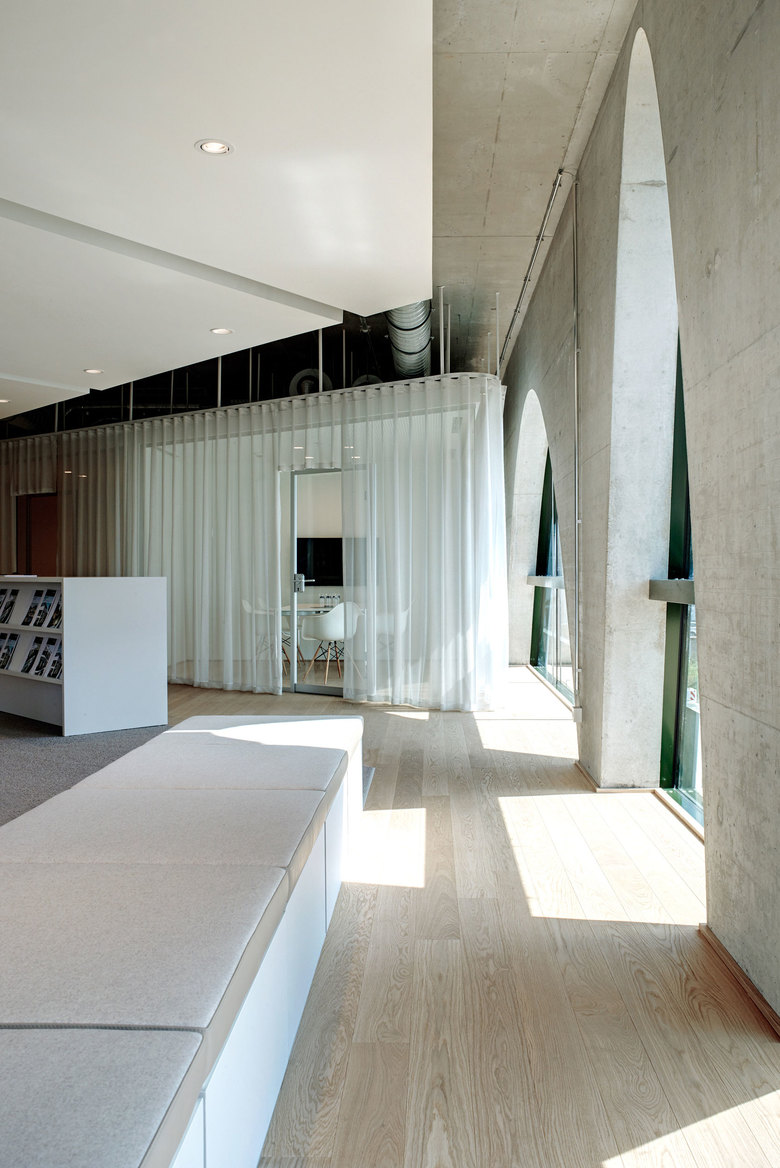 The polygonal rooms arrange themselves detached from the facade, divided by glass barriers with textile curtain elements. The rather harsh exposed concrete gains a cozy opposite with wooden flooring, carpeted areas and an individually adapted lighting.