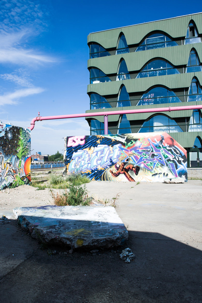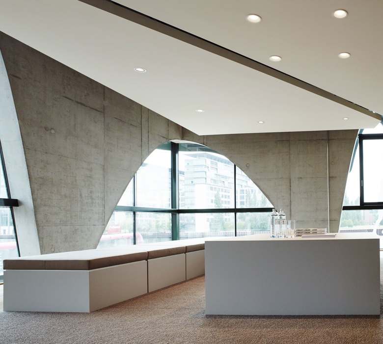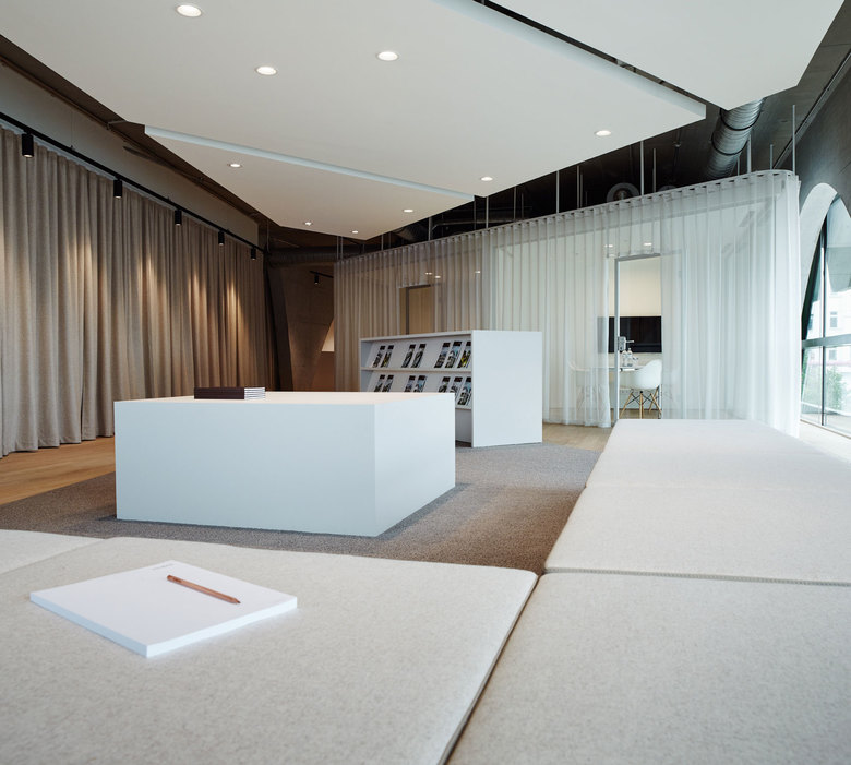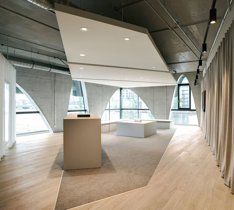 The project and the new showroom are right by the river Spree. The space defining front with its bent windows dominated the interior design. It was necessary to create a distinct world which neither competed with nor faded next to the existing construction.