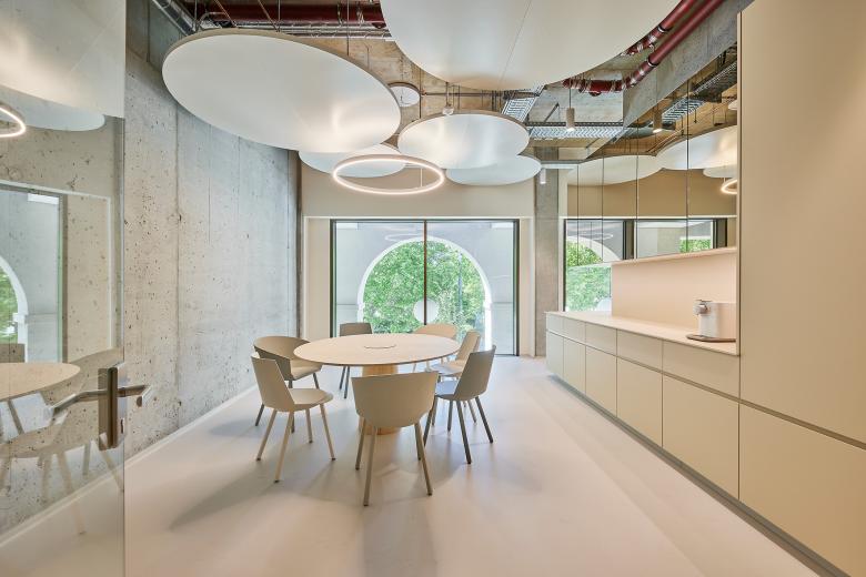 Diese Wegeführung wird durch raumbildende Einbauten und Elemente unterstützt, die aus der linearen Struktur und den schallabsorbierenden Wandverkleidungen aus Birkenholz hervortreten. Ihre skulpturale Formgebung setzt ebenso visuelle Akzente wie die akustisch wirksamen Deckensegel mit integrierten Langfeldleuchten und die maßgefertigten Garderobenschränke. Gleichzeitig sorgen sie für eine angenehme und diskrete Raumakustik in einem vertraulichen Umfeld.
