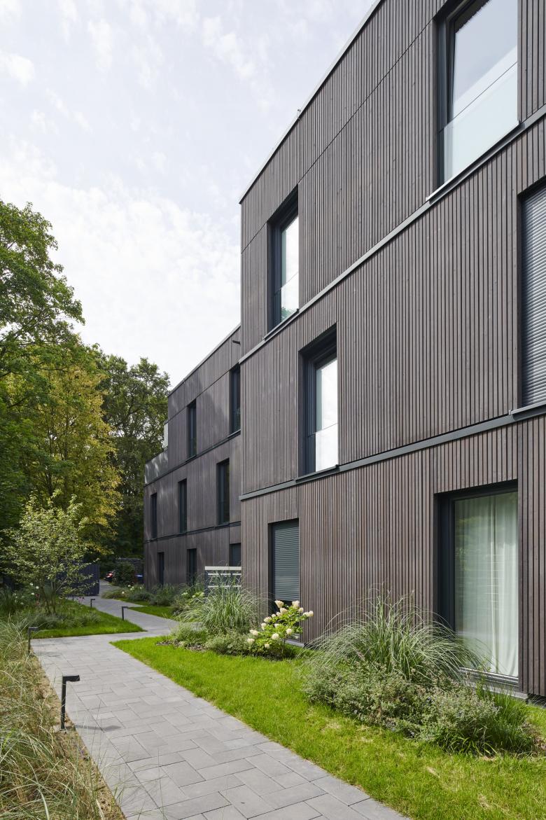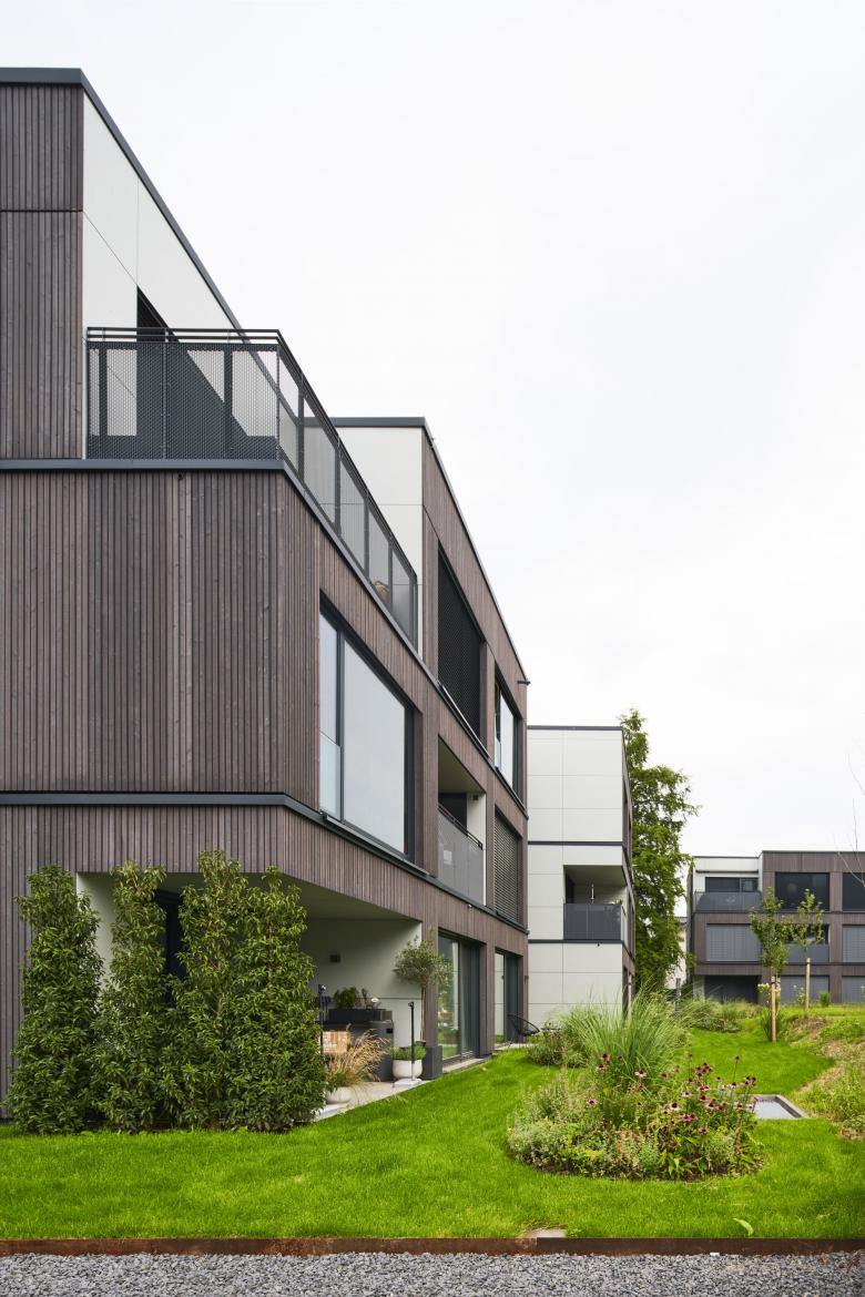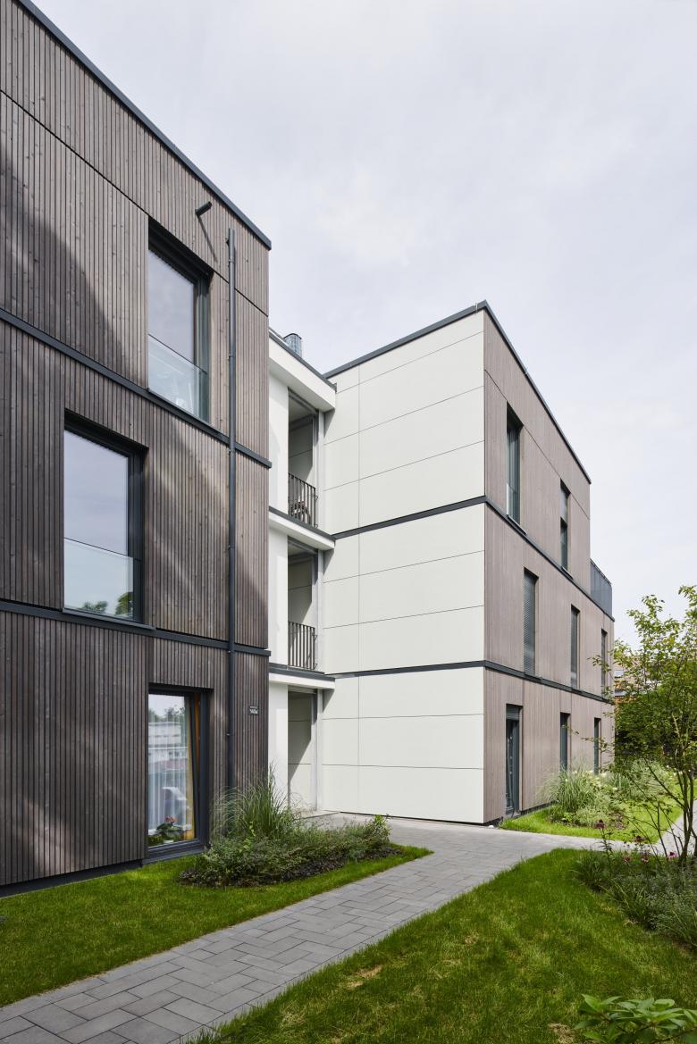 Along with one existing structure, two new apartment buildings - each split into two by a transparent stairway - shape an inviting, green courtyard that serves as a shared community resource. Designed for high energy efficiency, the new buildings feature renewable wood as a primary construction material, which is used both in structural elements as well as façade cladding. Each apartment contains at least one generous terrace or loggia.