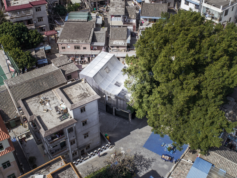 House 10, originally a frame-structure single-floor building, is renovated based on the existing conditions and topography as well as the design concept of interconnection, integration and transparency. "interconnection" -- with diagonal stairways embedded into existing building, alleys and Banyan Square are interconnected, continuing the typical feature of alleys in urban village to be accessible from all directions. "Integration" -- the original frame structure on F1 is retained as the basic building structure, from which a new F2 is added. The curved roof and skylight echo with the banyan at the shrine from a distance, reinforcing the sense of place. "Transparency" -- transparent sunlight panels reduce the massiveness of the building, while the interior and exterior building spaces mutually penetrate into each other. The light and transparent facade of the added F2 and roof constitute a sharp contrast with the massiveness of the original concrete structure.