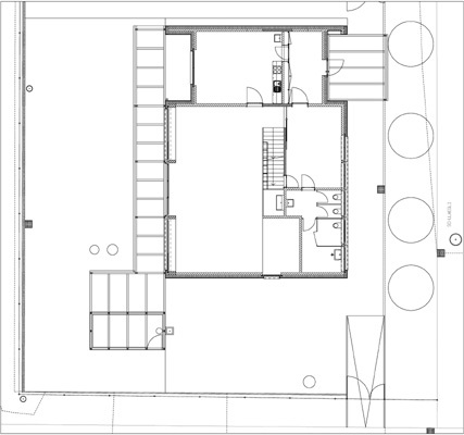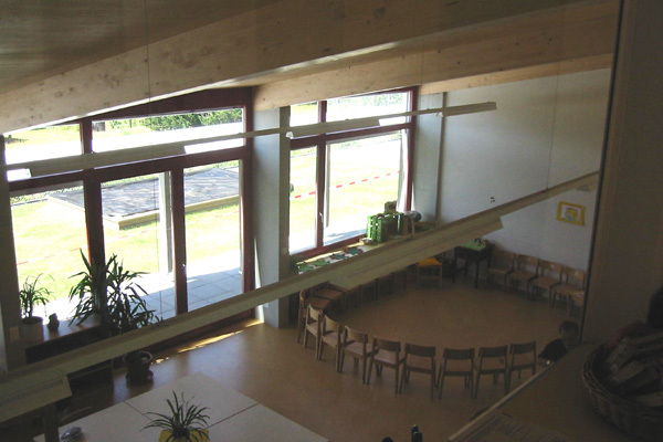 Das Raumangebot ist auf zwei Geschosse verteilt. Im Erdgeschoss liegt der Hauptraum des Kindergartens welcher über einen Windfang und die Garderobenanlage erreicht wird. Der Garderobe zugeordnet ist ein Sanitärbereich mit WC-Anlagen, Putz- und Installationsraum. Zum Hauptraum gehören eine Spielnische und ein Gruppenraum, welcher auch direkt vom Windfang aus zugänglich ist und auch von einem zweiten Kindergarten genutzt werden kann.