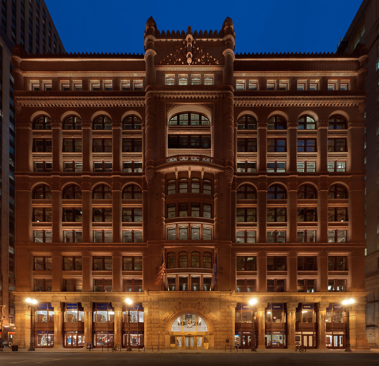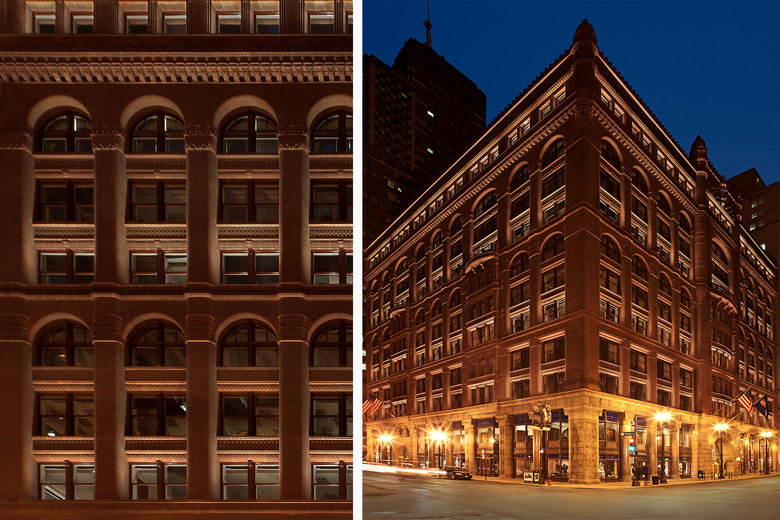 The Rookery makes history again as nighttime lighting graces its façades for the first time since its completion in 1888. The exterior lighting softly highlights the structure’s distinctive red color and intricate masonry, giving the structure an elegant nighttime presence and distinguishing it from its neighbors. To fulfill the Chicago Landmarks Commission requirements, custom miniature LED luminaires are concealed from pedestrian view, using field-adjustable mounting arms that minimize contact with the historic facade. Special micro-optics create a flattened cone of illumination three stories high, eliminating glare for tenants and without spilling light into the night sky.