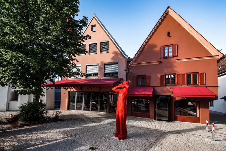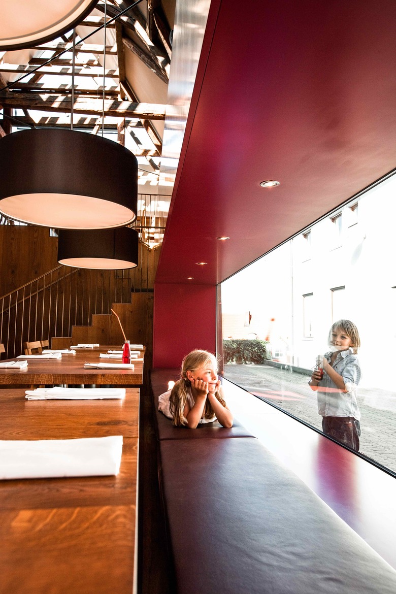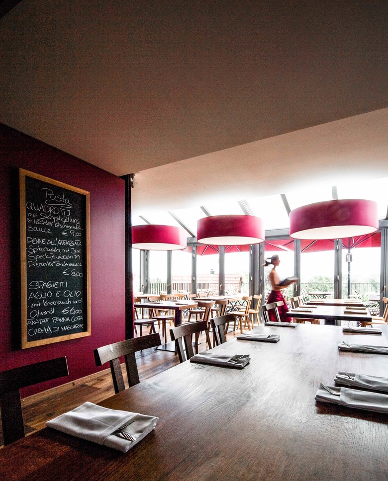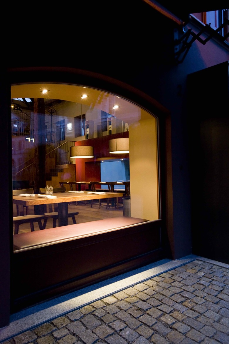 Zwei historische Stadthäuser in direkter Nachbarschaft der alten Kirche werden entkernt, saniert und für ein italienisches Restaurant miteinander verbunden. Der Gast wählt zwischen vielfältigen Raumsituationen: Verglaster Panoramablick oder lauschige Weinstube, Kaminlounge oder Galerie im altem Dachgebälk. Raumstimmung in geölter Eiche und bordeauxrotem Leder. Im Freien reihen sich lange Massivholztische und eine Skulptur von Josef Lang. Die gelungene Revitalisierung des Burgauer Kirchplatzes.