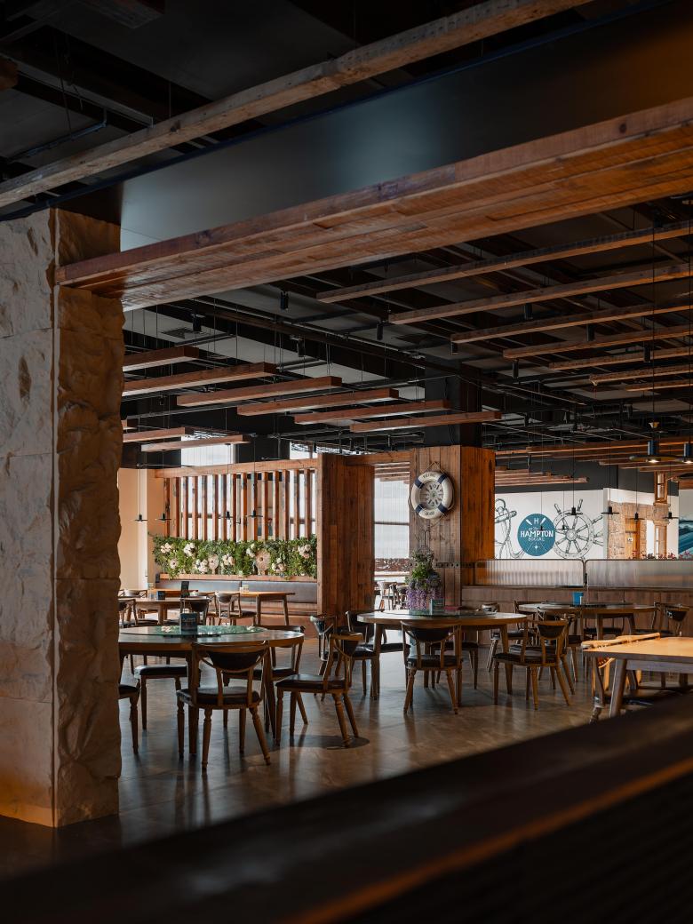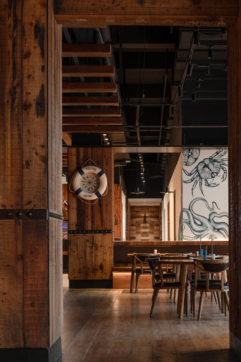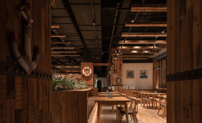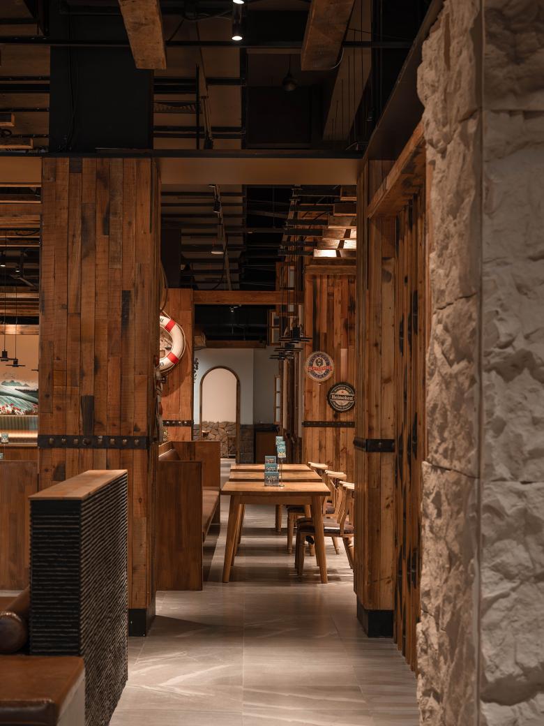 In this project, the bar, serving as the visual anchor and functional hub of the space, is positioned at the intersection of the restaurant's main axes. The design employs a monolithic dark oak panel with a matte finish, preserving the natural wood texture and hand-sanded traces to evoke a rustic and 沉稳 (stable) "ship 舷 (hull)" aesthetic. The bar's facade uses recycled wooden planks spliced in staggered joints, forming a structural language akin to the waterproof planking of fishing boats, thereby enhancing the narrative atmosphere within the "wharf" contextual framework.