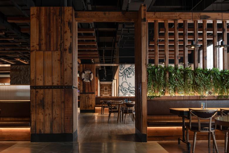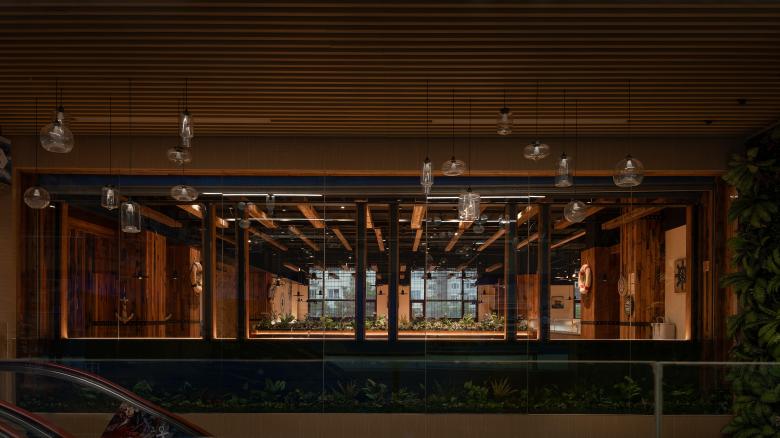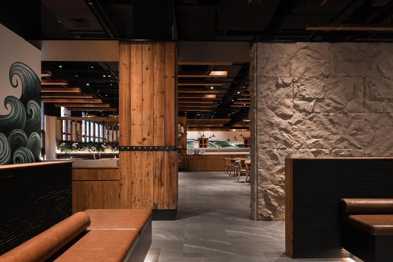 The project organizes the interior space through a tripartite strategy of structure, material, and atmosphere. It retains the openness and lively spirit of a traditional seafood street diner (“dapai dang”), while reinterpreting it through contemporary spatial methods. This is achieved by reconstructing timber frameworks, layering lighting strategies, embedding circulation paths, and introducing moments of enclosure—thereby aligning functional efficiency with spatial storytelling. The overall interior is divided into a three-part sequence: The street-facing reception zone welcomes guests with an open layout and a display ice pool, evoking the coastal imagery of “fresh catch landing ashore”; The central dining hall is governed by a system of timber frameworks that define order and rhythm, fostering a sense of gathering and social intimacy; The innermost section features semi-enclosed dining booths tailored for family meals and small-group interactions.