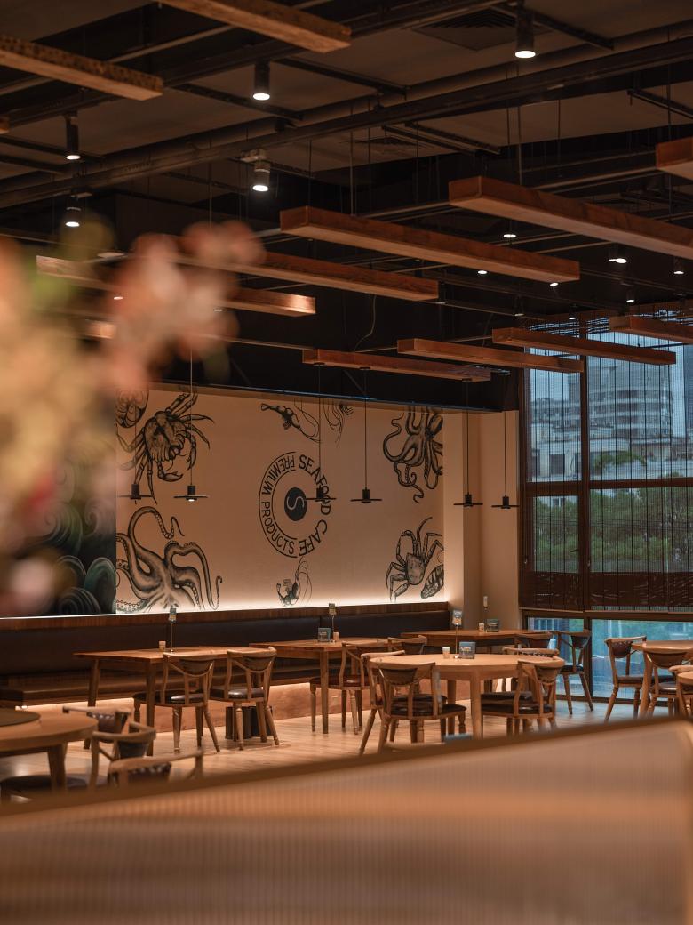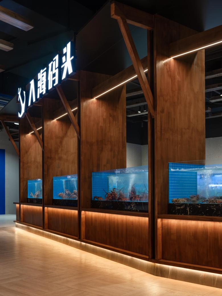 The seafood display area is located between the entrance of the restaurant and the main hall, which is the key node connecting the external market atmosphere and the internal dining experience. The design is based on the logic of the ‘dock to shore’ dynamic line to create a visual focus, and the entire surface of the customised blue aquarium glass fish tanks, forming a sense of experience similar to the ‘ready-to-eat’ seafood experience in the coastal fishing market.