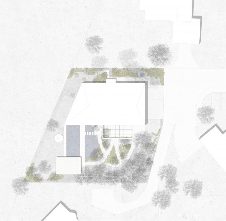 Das am Siedlungsrand der sanft modellierten Landschaft rund um Dinhard liegende Einfamilienhaus wird geprägt durch seine vielfältige Gartenanlage. Das Gebäude steht quer zum Hang, und öffnet sich mit der langen Fassade gegen Süden. Eine grosszügige Terrasse mit filigraner Pergola erlaubt attraktive Blicke in den Garten.