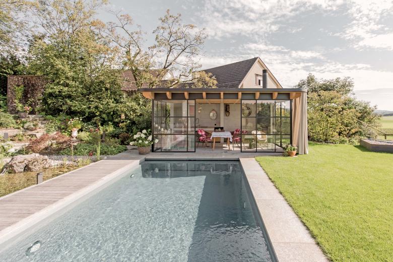 Ein malerischer Baumbestand schützt den Badebereich auf der Südseite und bildet eine grüne Kulisse. Richtung Westen erfährt der Garten eine imposante Weite durch die umliegenden Felder.