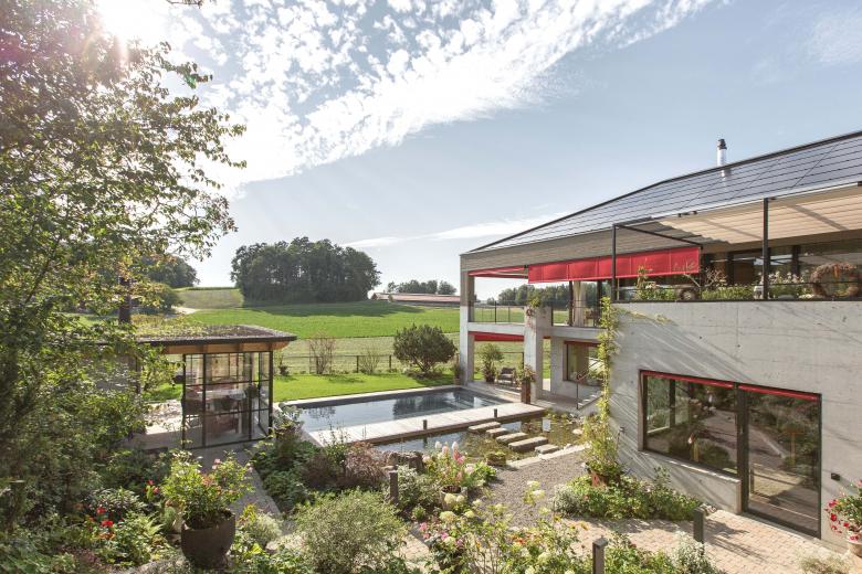 Auf Gartenniveau befindet sich eine geschützte Loggia. Zwischen dem Gebäude und einem gläsernen Pavillon spannt sich ein Biopool mit einer Teichanlage zur natürlichen Reinigung des Wassers auf. Trockenheitsliebende Stauden und kleine Sträucher wachsen am steinernen Hang der nach Südwesten ausgerichtet ist.