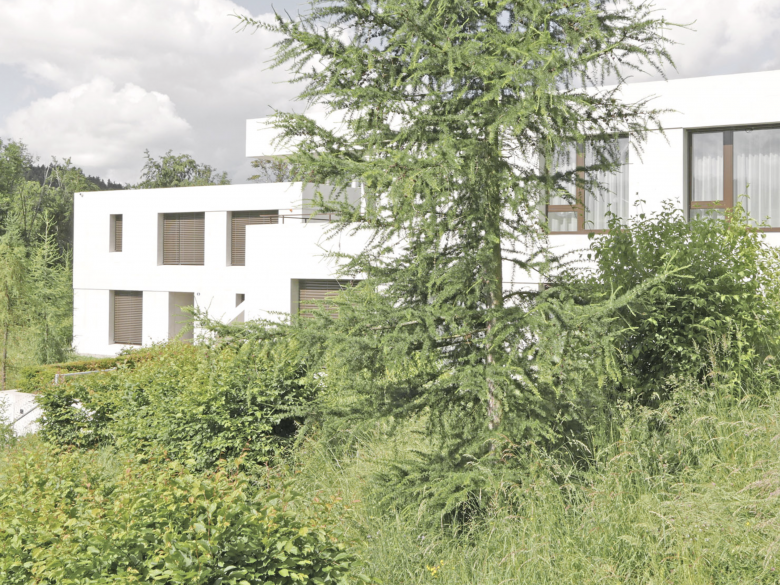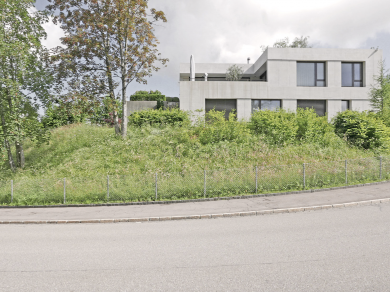 Die Bauparzelle liegt im Ortsbildschutzgebiet am südlichen Rand der Teppichsiedlung Biserhof aus dem Jahre 1956. Der Projektvorschlag mit seinen beiden Einfamilienhäusern führt die Bebauungstypologie der Winkelform weiter und erzeugt, analog zur bestehenden Siedlung, private Aussenräume mit hoher Aufenthaltsqualität. Die Zweigeschossigkeit der Neubauten und deren Einbettung resultiert aus den veränderten topografischen Gegebenheiten, die durch die Umlegung der Kammelenbergstrasse entstanden ist. Die Überlegungen zur Wohnqualität sind die gleichen wie in der Teppichsiedlung von Danzeisen+Voser. Es geht um die Konzentration der Freifläche auf den Wohngarten, der in unmittelbarem Zusammenhang mit den Wohnräumen steht und ringsum von Einblick geschützt und gut besonnt ist. So bilden geschützte Terrassen und überdachte Loggien die privaten Rückzugsorte. Grosszügige Rasenflächen, vielschichtige Treppenanlagen und Kiesflächen umfliessen die Bauten und gegen die Randbereiche akzentuieren geschnittene Gehölzkörper und hochstämmige Lärchen die Parzellenränder.