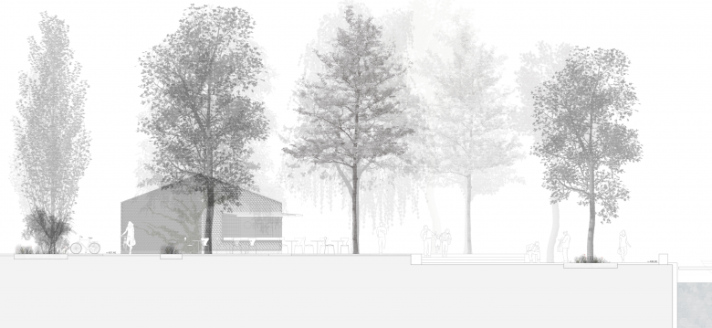 Der neue Pavillon fügt sich als Auftakt zur neuen Hafenpromenade Enge im Norden des Perimeters ein und reiht sich in die Abfolge von Kleinbauten der Bootsvermietung sowie den Gebäuden der Badi Enge ein. Der Pavillon erweckt verschiedene Assoziationen zum Thema Hafen. So erinnern zum Beispiel Proportion und Dachform an typische Werft- und Lagerhäuser. Die sichtbaren Öffnungen sind bewusst minimal gehalten und akzentuieren die öffentlich zugänglichen Bereiche. Zwischen Gebäude und Gewässerabstand erzeugen locker verteilte Tische eine Bistroatmosphäre und leiten gegen Süden auf den unter Bäumen liegenden, lauschigen Aussenbereich über. Die Holzfassade aus diagonal angeordneten Holzlatten wird partiell berankt. Ein Brunnen sorgt für Erfrischung und zusätzliche Aufenthaltsqualität.