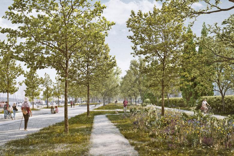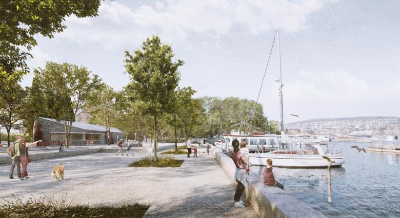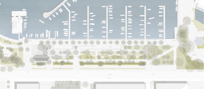 Leicht verbreitert und vertieft wird die Promenade entlang der Hafenmole als wichtiges Element beibehalten. Lange Sitzelemente unterstreichen die stringente Form, die Anordnung bietet spannende Sichtbezüge in den Stadtgarten und über die Weite des Sees.