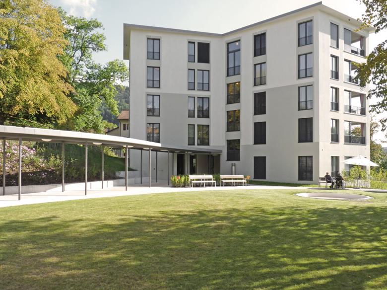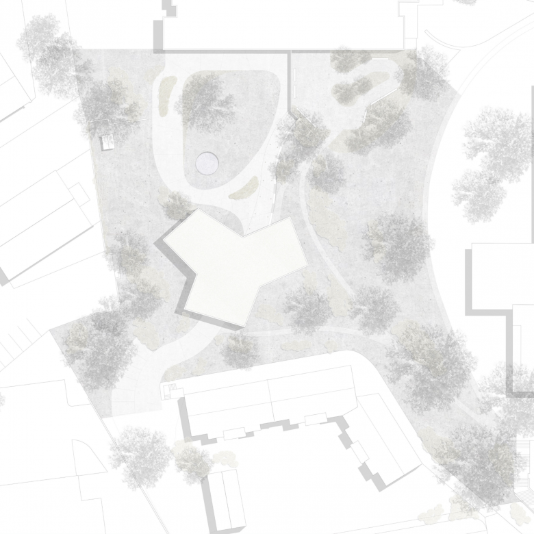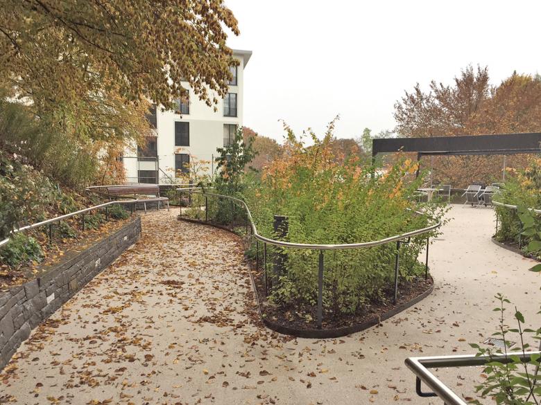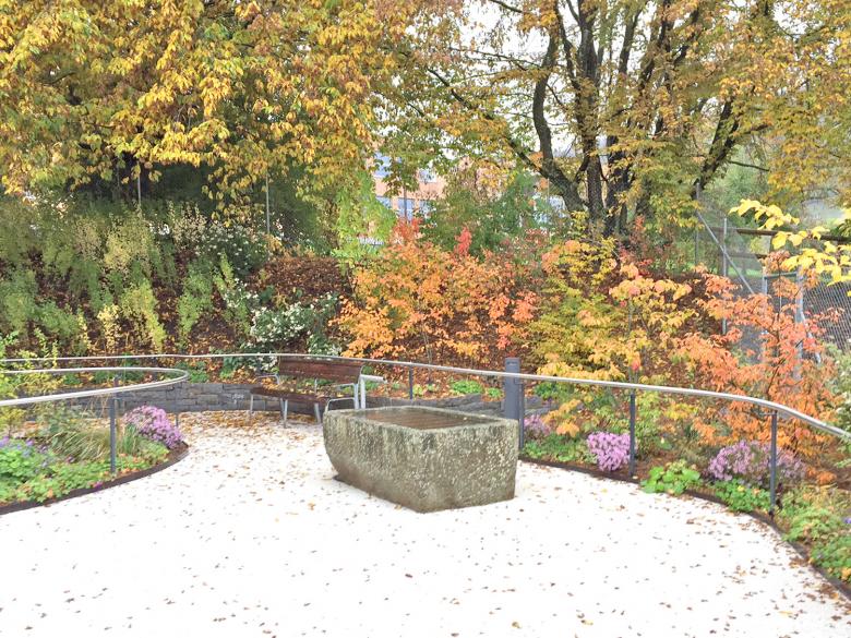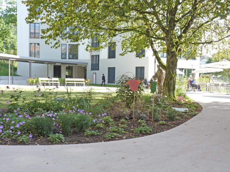 Der Neubau Alterswohnungen St. Otmar fügt sich als Solitär in die heterogene Gruppe von Pflegeheim, Schulhaus St. Otmar und den bestehenden Wohnbauten an der Zürcherstrasse ein. Die neue Freiraumgestaltung orientiert sich stark am jetzigen Bestand, der Topografie, dem landschaftlichen Charakter des Perimeters und den bestehenden, geschützten Gehölzen. Die kleine Parkanlage mit bestehender Wasserfläche funktioniert neu als Scharnier und Ruheoase zwischen Pflegeheim und den Alterswohnungen. Der durchgehende Bodenbelag unterstreicht den verbindenden Charakter. Durch den Neubau entsteht eine intime, hofähnliche Situation mit hoher Aufenthalts- und Begegnungsqualität. Ein einfaches, direktes und hindernisfreies Wegesystem bindet Pflegeheim und Alterswohnungen an die Zürcherstrasse mit den Bushaltestellen und den neuen Besucherparkplätzen an. Auf Ebene Pflegeheim entsteht neu ein Sinnesgarten für demenzkranke Bewohner. Natursteinmauer, eine vielfältig duftende und blühende Bepflanzung, ein plätschernder Brunnen, unterschiedliche Sitzgelegenheiten und ein durchgehender Handlauf kennzeichnen den Dementengarten. Die bestehenden Wiesenflächen bleiben bestehen und sollen den neuen Solitärbau zusammen mit den ökologisch wertvollen Heckenkörpern `umfliessen` und diesen wie selbstverständlich in die Umgebung einbinden.
