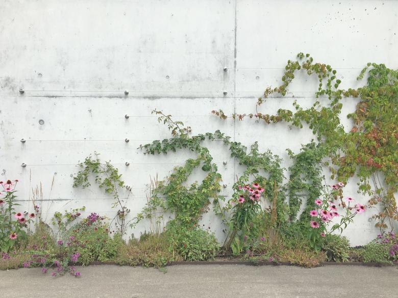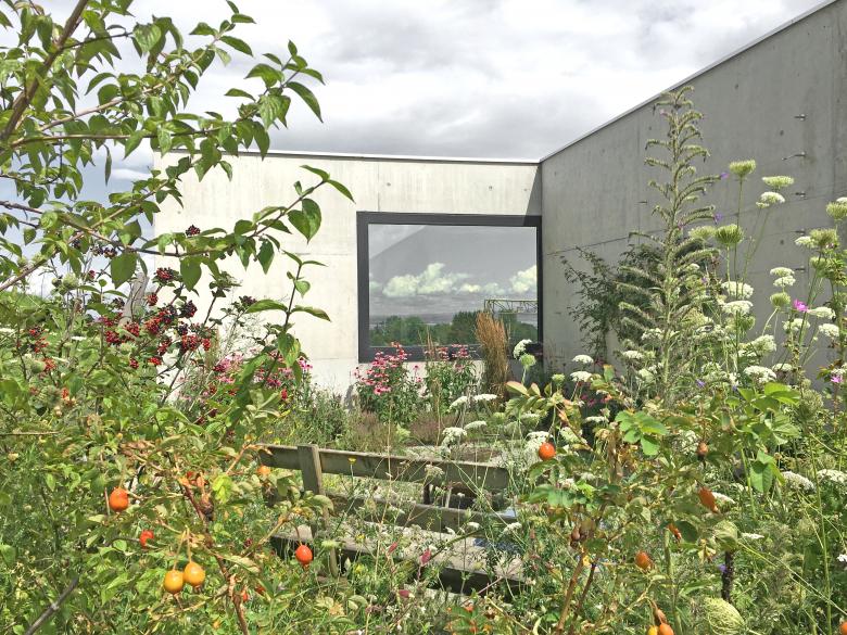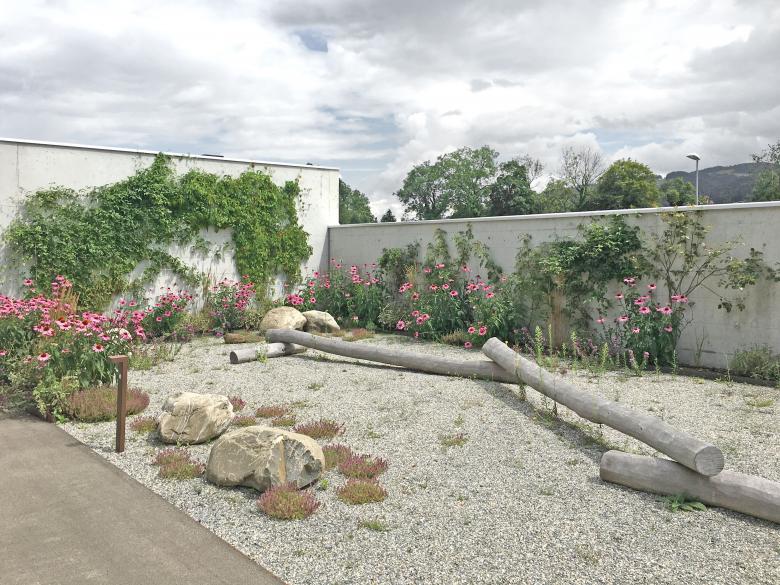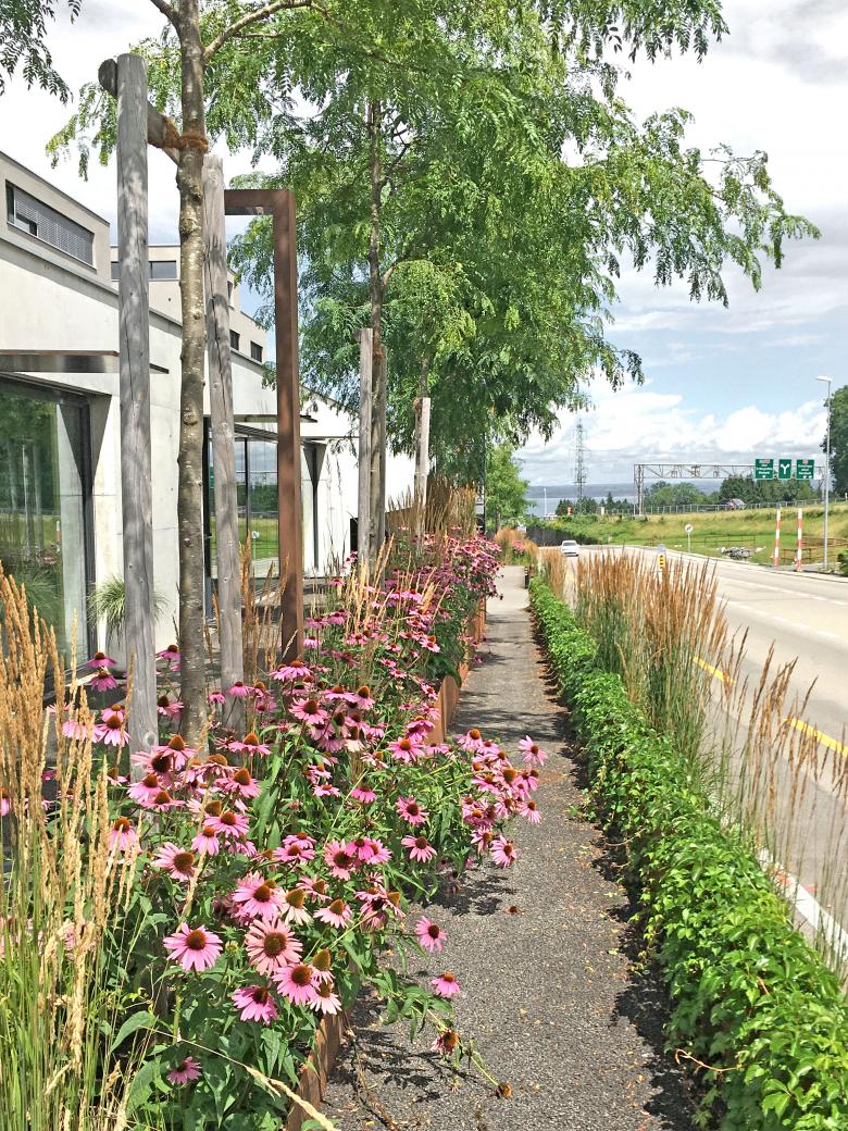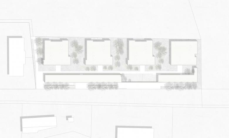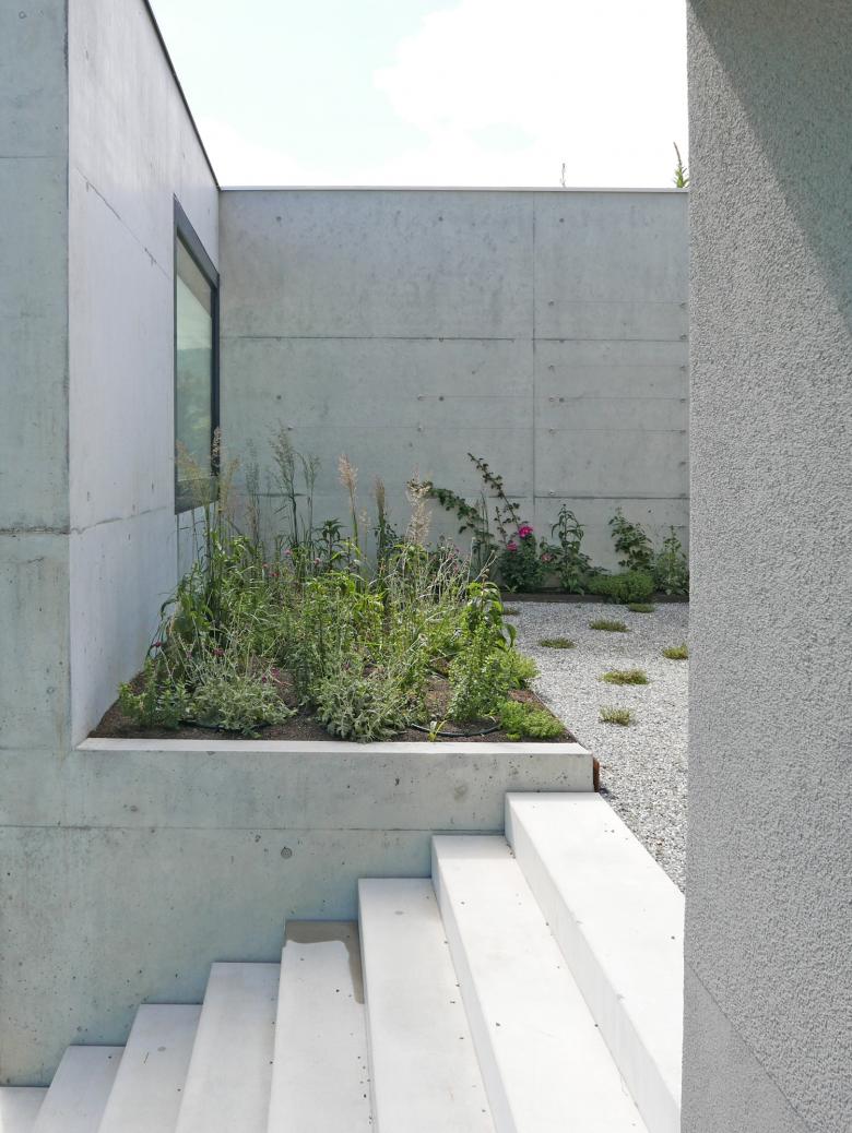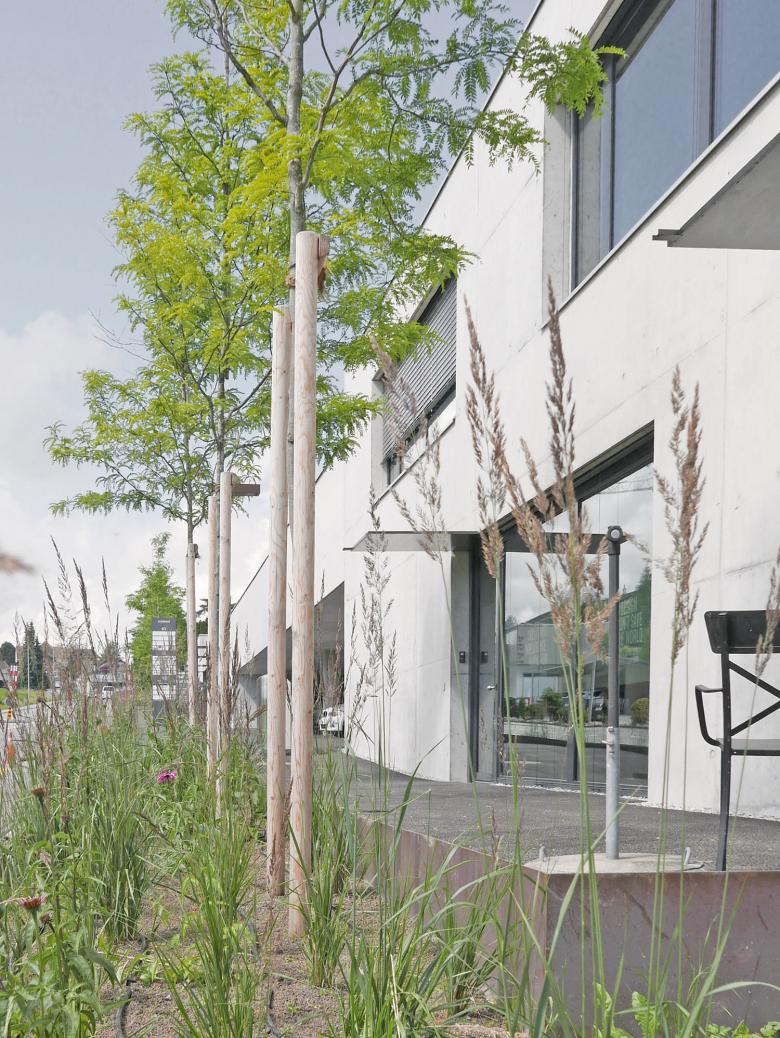 Die südöstlich der Rorschacherstrasse gelegene Parzelle grenzt im Nordwesten an die Landwirtschaftszone mit unverbautem Blick auf den Bodensee. Aus dieser Situation ergibt sich die Herausforderung der Lärmbelastung im Osten und der sonnenabgewandten Panoramaseite. Entlang der Kantonsstrasse wird als Schallpuffer ein zweigeschossiger Riegel mit einem bunten Mix an Gewerbeflächen situiert. Der höhengestaffelte Sockelbau grenzt auf der oberen Ebene zudem eine Hofzone zur Wohnbebauung vom darunter liegenden Strassenraum ab. Durch die Hierarchie und Zugänglichkeit der Ebenen werden öffentliche wie halböffentliche Zonen unterschiedlicher Qualitäten geschaffen. Die Wohnüberbauung artikuliert sich mit vier in Reihe gestellten quadratischen Punktbauten aus vier Vollgeschossen. Die einzelnen Baukörper sind zur Einbettung in die vorhandene Topografie höhenversetzt. Gestaffelte Stahlabschlüsse, Pflanzrabatten mit Ziergräsern und hochstämmige Gleditschien separieren die Gewerbezugänge vom Strassenraum. Auf Niveau Eingänge der Wohnbauten bildet eine geschickt platzierte Sichtbetonwand gegen die Strasse eine hofartige, intime Situation. Clematis, Kletterrosen und wilder Wein bedecken die Betonwand partiell und spiegeln mit den unterschiedlichen Farben die Jahreszeiten wieder. Asphaltierte Zugangswege, grosszügige Kiesflächen, ein Spielbereich und eine Bocciabahn sorgen für eine wohnliche Atmosphäre. Zwischen den Wohnbauten und gegen die Landwirtschaftszone bilden modellierte Geländehügel, bewachsen mit einer Hochstaudenflur und einheimische Gehölzgruppen, für eine intimere Rückzugsmöglichkeit auf den Terrassen und Balkonen.