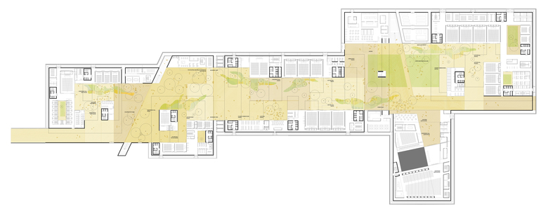 On the connective are planned the accesses to the faculties, the general services and the largest classrooms. The garden becomes a real outdoor extension of the working/studying areas. From east and from west one accesses to the dorsal through low gradient ramps, while from north and from south spacious staircases allow the direct access from the existing roads.