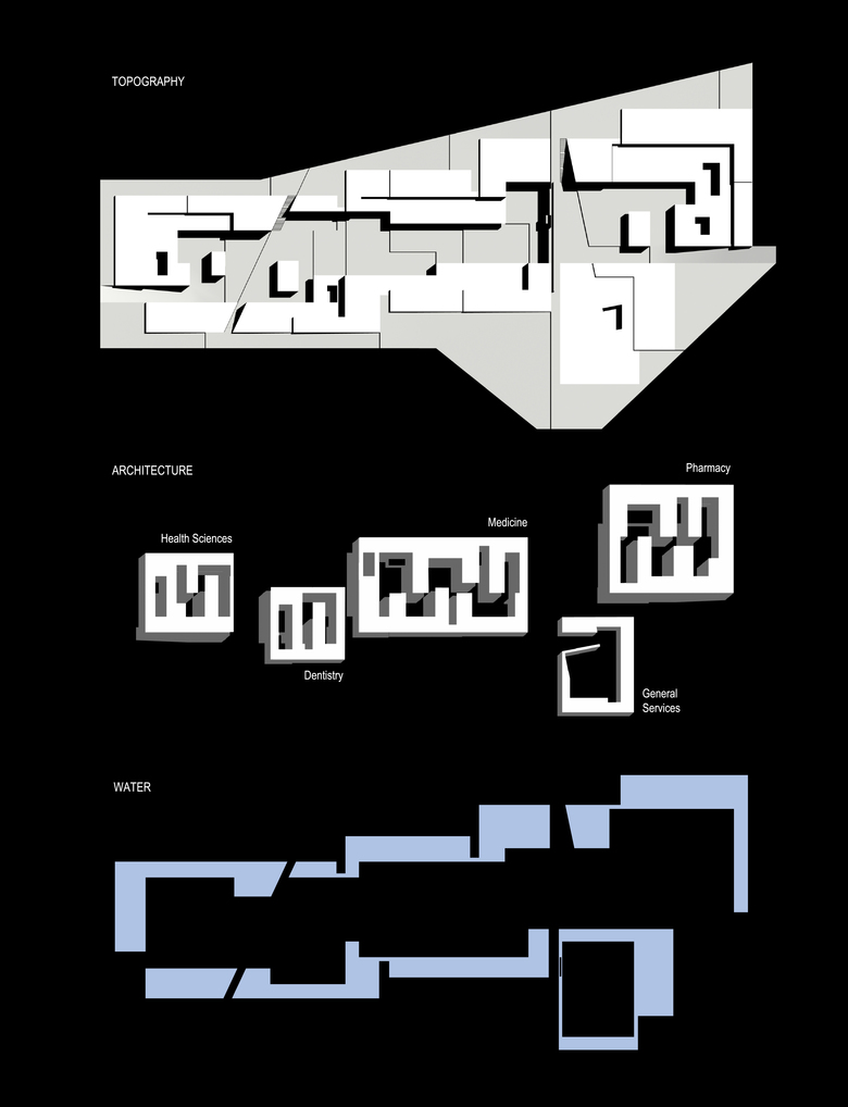 Vast water surfaces, fed by the winter rain-water collected and stored in underground tanks, isolate the external fronts of the buildings producing scenic effects and to indicate that life develops entirely inside. A further climatic filter will be constituted by the masses of a luxuriant vegetation, a rich pine-wood that inside the buildings perimeters mixes with palms, fruiting and medicinal plants. In the urban landscape the new campus of the medical sciences will be perceived as a sort of fertile oasis.