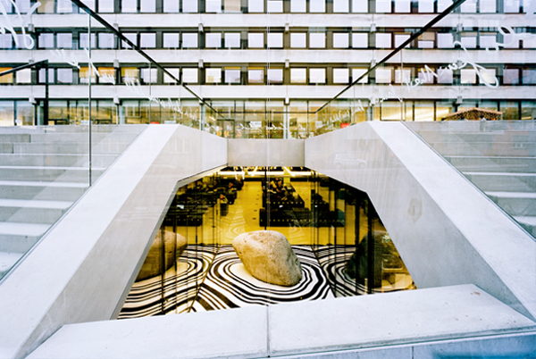 Das Kunst & Bau Projekt "on stone" von Georgia Creimer betont die Architektur. Acht in den Lichthöfen platzierte Findlinge stellen eine visuelle Verbindung zwischen dem öffentlichen Straßenraum und dem Inneren der Bibliothek her.